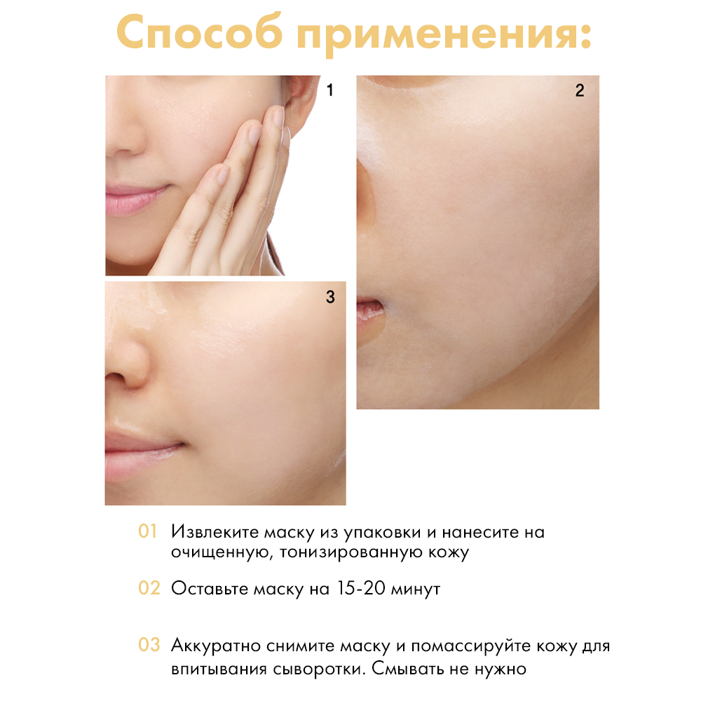 Применение: Извлеките маску из упаковки. Затем расположите маску на поверхности очищенной, тонизированной кожи и оставьте на 15-20 минут. Аккуратно снимите маску и легко помассируйте, чтобы увлажняющая сыворотка впиталась. Не требует смывания. Для достижения лучшего эффекта рекомендуется повторять процедуру 3 раза в неделю. При обнаружении чувствительности к компонентам прекратить использование. Маска предназначена для одноразового применения.