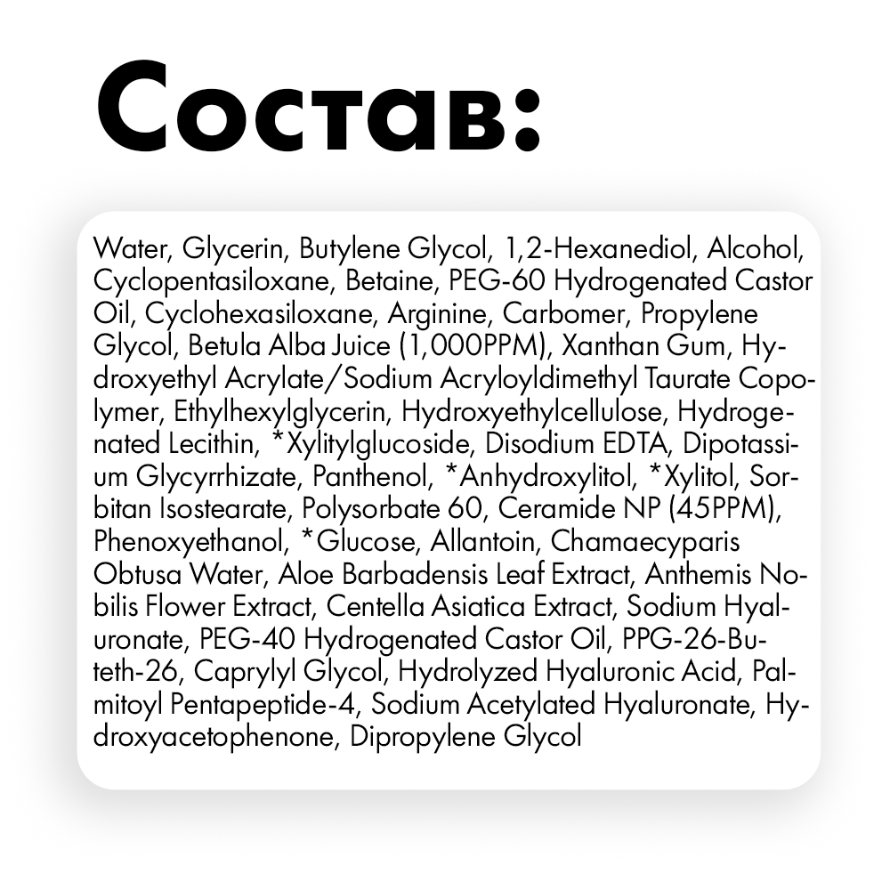 Состав: Water, Glycerin, Butylene Glycol, 1,2-Hexanediol, Alcohol, Cyclopentasiloxane, Betaine, PEG-60 Hydrogenated Castor Oil, Cyclohexasiloxane, Arginine, Carbomer, Propylene Glycol, Betula Alba Juice (1,000PPM), Xanthan Gum, Hydroxyethyl Acrylate/Sodium Acryloyldimethyl Taurate Copolymer, Ethylhexylglycerin, Hydroxyethylcellulose, Hydrogenated Lecithin, *Xylitylglucoside, Disodium EDTA, Dipotassium Glycyrrhizate, Panthenol, *Anhydroxylitol, *Xylitol, Sorbitan Isostearate, Polysorbate 60, Ceramide NP (45PPM), Phenoxyethanol, *Glucose, Allantoin, Chamaecyparis Obtusa Water, Aloe Barbadensis Leaf Extract, Anthemis Nobilis Flower Extract, Centella Asiatica Extract, Sodium Hyaluronate, PEG-40 Hydrogenated Castor Oil, PPG-26-Buteth-26, Caprylyl Glycol, Hydrolyzed Hyaluronic Acid, Palmitoyl Pentapeptide-4, Sodium Acetylated Hyaluronate, Hydroxyacetophenone, Dipropylene Glycol