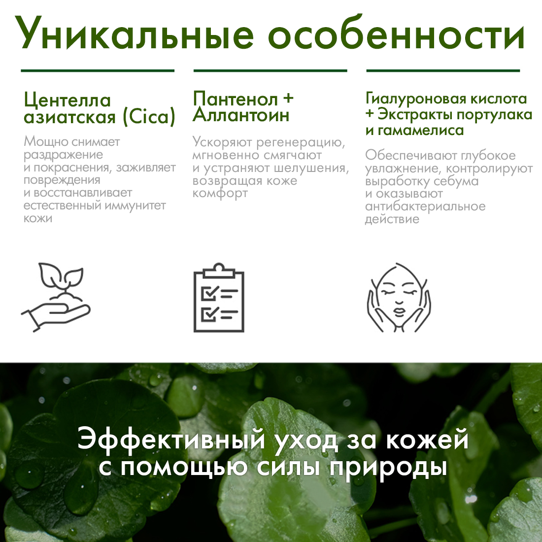 Быстро снимает раздражение и шелушение, укрепляет сопротивляемость стрессам. Восстанавливает защитный барьер сухой, чувствительной, поврежденной кожи, моментально снимает дискомфорт. Интенсивно увлажняет, способствует сужению пор и нормализации выработки кожного сала. Обладает ярко выраженным антибактериальным действием, снимает раздражения и устраняет красноту, улучшает цвет лица, возвращает коже здоровое сияние. Повышает иммунитет кожи за счет длительной и глубокой гидратации.