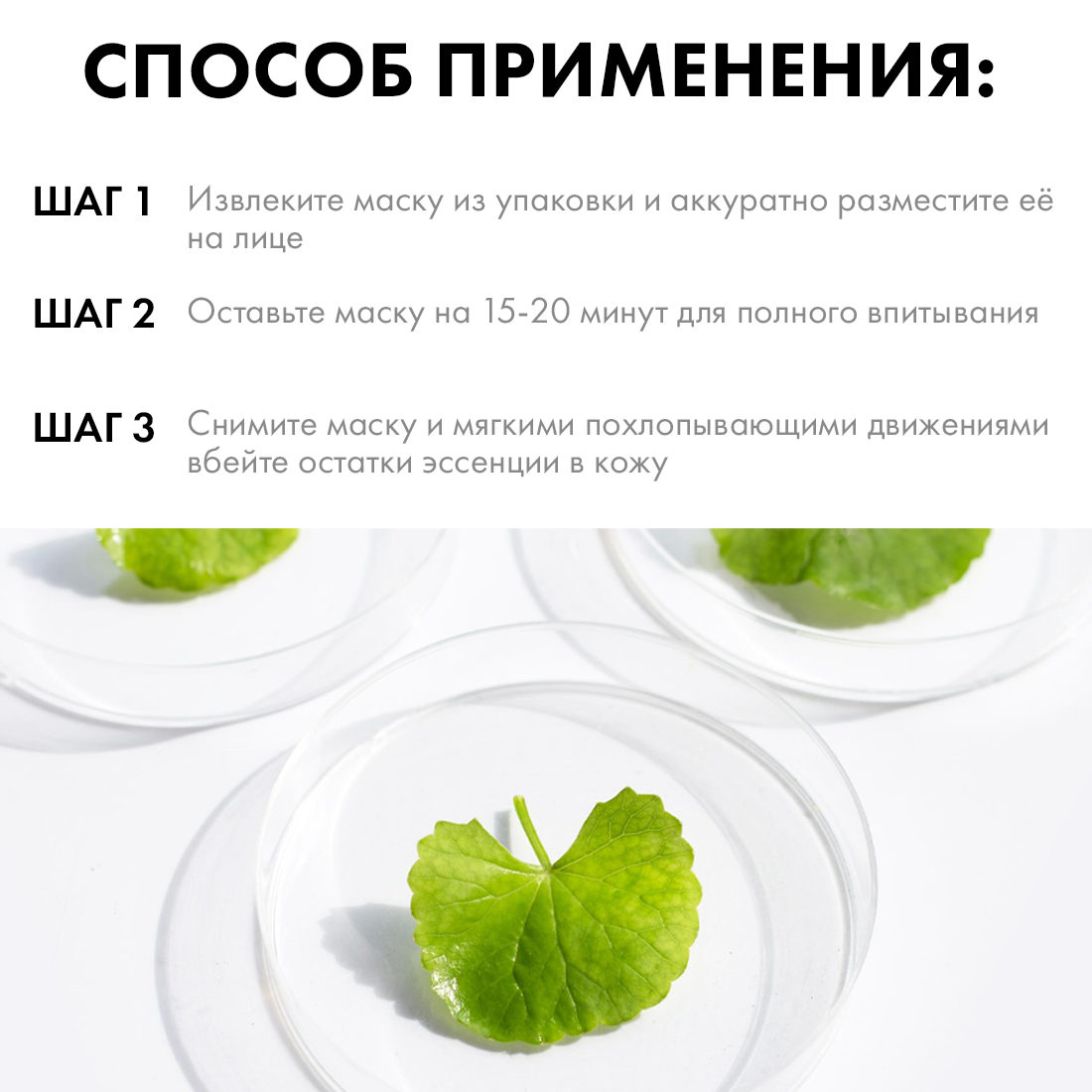 Способ применения: Извлеките маску из упаковки. Затем расположите маску на поверхности очищенной, тонизированной кожи и оставьте на 15-20 минут. Аккуратно снимите маску и легко помассируйте, чтобы увлажняющая сыворотка впиталась. Не требует смывания. Для достижения лучшего эффекта рекомендуется повторять процедуру 2-3 раза в неделю. При обнаружении чувствительности к компонентам прекратить использование. Маска предназначена для одноразового применения.