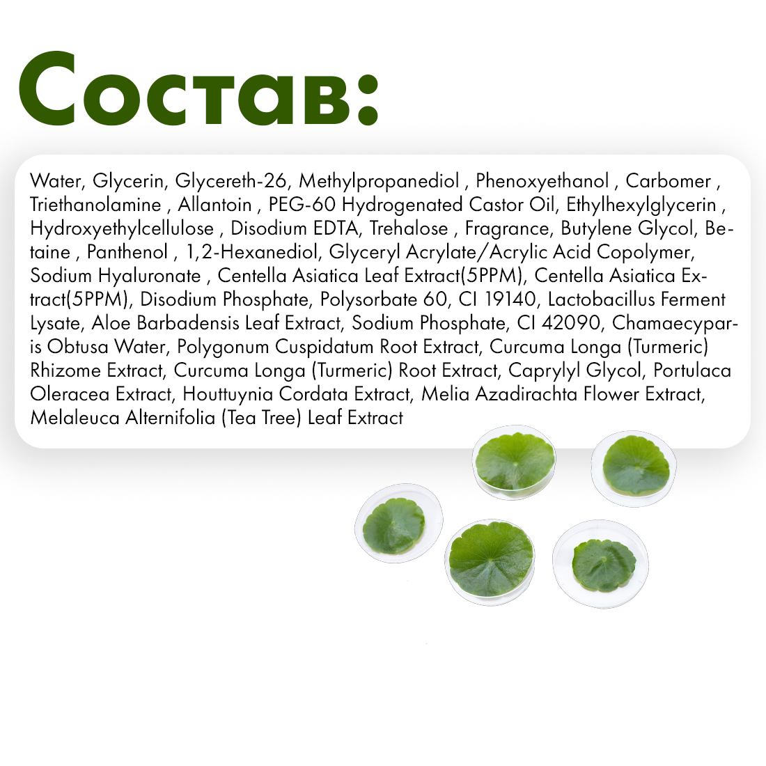 Состав: Water, Glycerin, Glycereth-26, Methylpropanediol , Phenoxyethanol , Carbomer , Triethanolamine , Allantoin , PEG-60 Hydrogenated Castor Oil, Ethylhexylglycerin , Hydroxyethylcellulose , Disodium EDTA, Trehalose , Fragrance, Butylene Glycol, Betaine , Panthenol , 1,2-Hexanediol, Glyceryl Acrylate/Acrylic Acid Copolymer, Sodium Hyaluronate , Centella Asiatica Leaf Extract(5PPM), Centella Asiatica Extract(5PPM), Disodium Phosphate, Polysorbate 60, CI 19140, Lactobacillus Ferment Lysate, Aloe Barbadensis Leaf Extract, Sodium Phosphate, CI 42090, Chamaecyparis Obtusa Water, Polygonum Cuspidatum Root Extract, Curcuma Longa (Turmeric) Rhizome Extract, Curcuma Longa (Turmeric) Root Extract, Caprylyl Glycol, Portulaca Oleracea Extract, Houttuynia Cordata Extract, Melia Azadirachta Flower Extract, Melaleuca Alternifolia (Tea Tree) Leaf Extract.