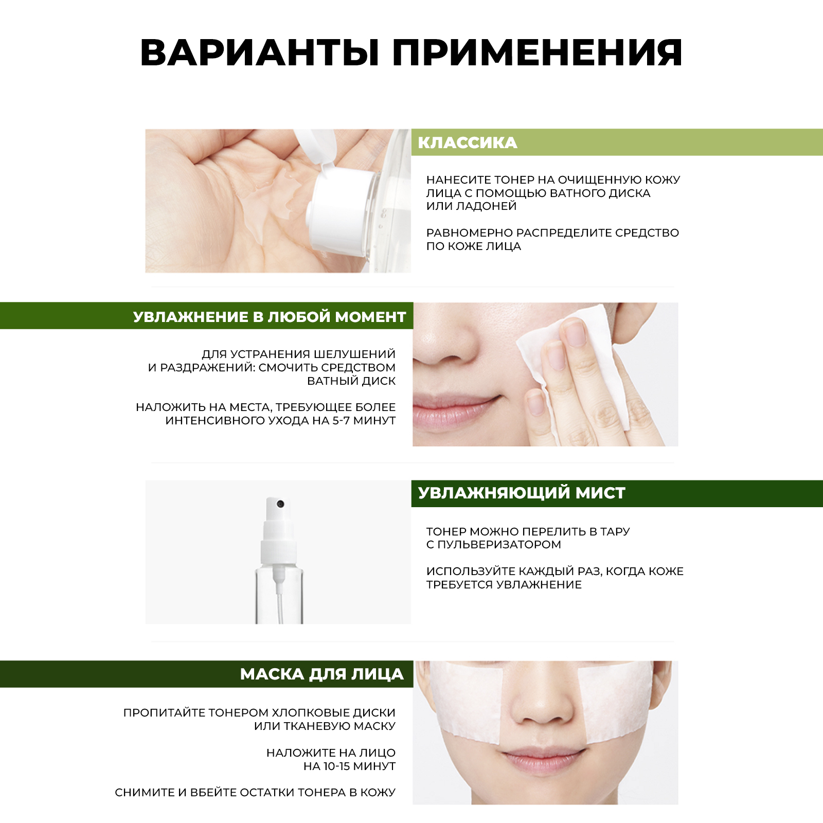 Способ применения: Смочите ватный диск и протрите кожу лица. Для устранения шелушений и раздражений: смочить средством ватный диск и наложить на места, требующее более интенсивного ухода на 5-7 минут. Можно использовать как ампульную эссенцию для маски: обильно смочите чистый тканевый лист маски и расположите маску на лицо на 10-15 минут. Такую маску можно делать ежедневно. Рекомендация: тонер можно перелить в тару с пульверизатором и использовать, как мист, каждый раз, когда коже требуется увлажнение. При обнаружении чувствительности к компонентам прекратить использование. Для всех типов кожи, включая чувствительную.