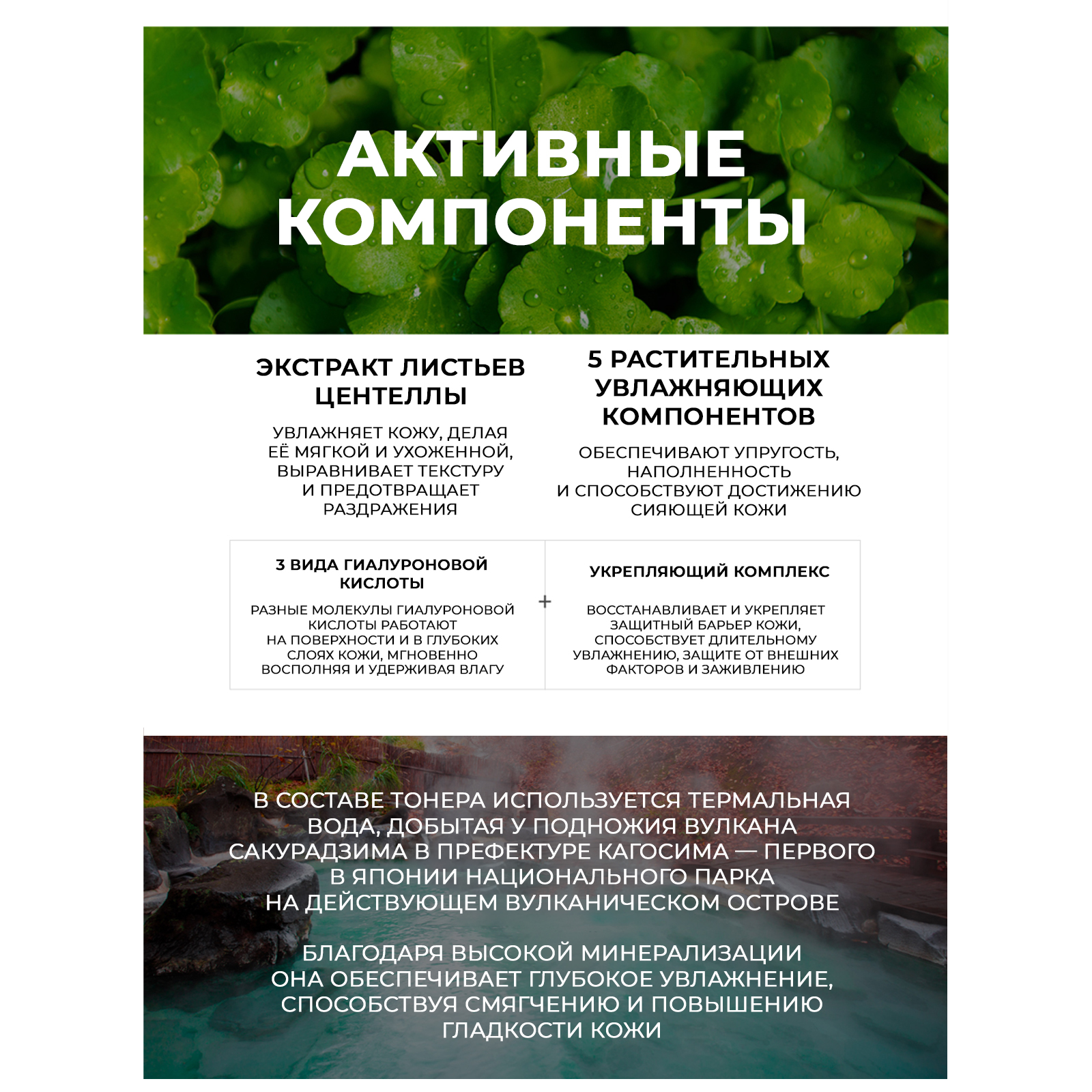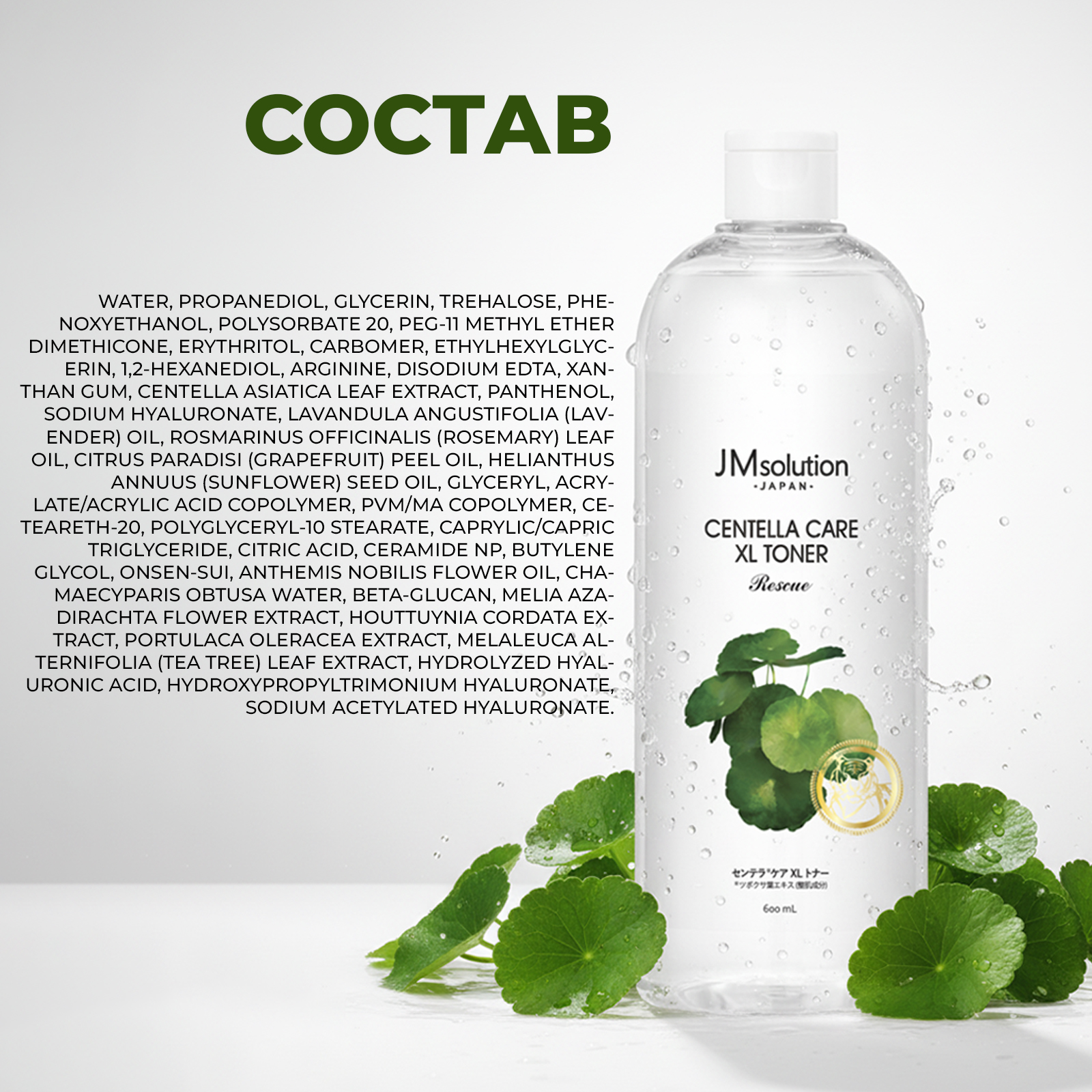 Состав: WATER, PROPANEDIOL, GLYCERIN, TREHALOSE, PHENOXYETHANOL, POLYSORBATE 20, PEG-11 METHYL ETHER DIMETHICONE, ERYTHRITOL, CARBOMER, ETHYLHEXYLGLYCERIN, 1,2-HEXANEDIOL, ARGININE, DISODIUM EDTA, XANTHAN GUM, CENTELLA ASIATICA LEAF EXTRACT, PANTHENOL, SODIUM HYALURONATE, LAVANDULA ANGUSTIFOLIA (LAVENDER) OIL, ROSMARINUS OFFICINALIS (ROSEMARY) LEAF OIL, CITRUS PARADISI (GRAPEFRUIT) PEEL OIL, HELIANTHUS ANNUUS (SUNFLOWER) SEED OIL, GLYCERYL, ACRYLATE/ACRYLIC ACID COPOLYMER, PVM/MA COPOLYMER, CETEARETH-20, POLYGLYCERYL-10 STEARATE, CAPRYLIC/CAPRIC TRIGLYCERIDE, CITRIC ACID, CERAMIDE NP, BUTYLENE GLYCOL, ONSEN-SUI, ANTHEMIS NOBILIS FLOWER OIL, CHAMAECYPARIS OBTUSA WATER, BETA-GLUCAN, MELIA AZADIRACHTA FLOWER EXTRACT, HOUTTUYNIA CORDATA EXTRACT, PORTULACA OLERACEA EXTRACT, MELALEUCA ALTERNIFOLIA (TEA TREE) LEAF EXTRACT, HYDROLYZED HYALURONIC ACID, HYDROXYPROPYLTRIMONIUM HYALURONATE, SODIUM ACETYLATED HYALURONATE.