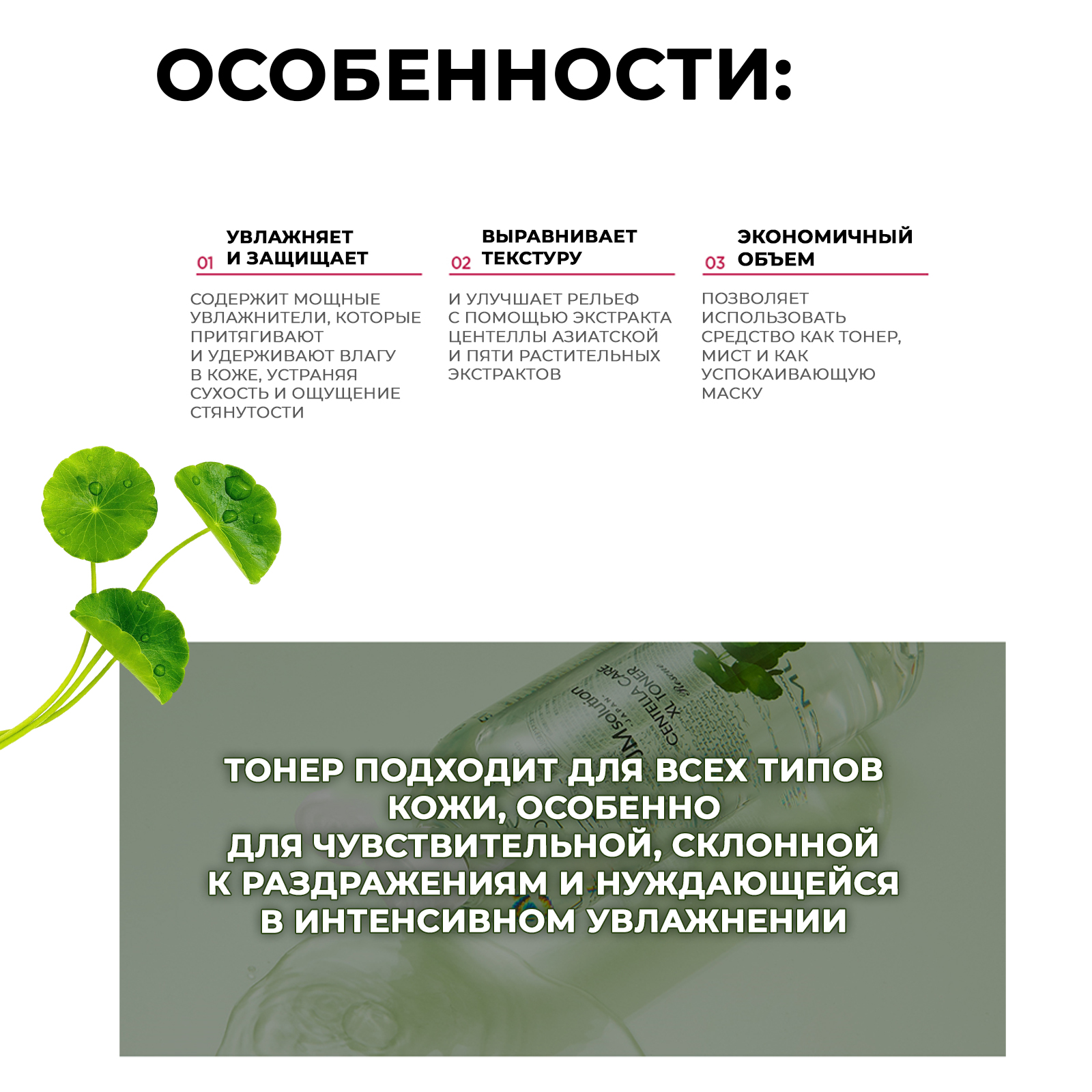 Успокаивающий тонер с центеллой азиатской для глубокого увлажнения и восстановления кожи. Подходит для всех типов кожи, обладает успокаивающим и обеззараживающим действием, эффективно увлажняет, устраняет сухость и раздражения, снимает красноту и улучшает тон кожи. Особенно рекомендуется при куперозе, укрепляет капилляры и уменьшает выраженность сосудистых звездочек. Образует на поверхности эпидермиса защитный барьер, который предупреждает потерю влаги. Эффективно воздействует на чувствительную, жирную и сухую кожу, устраняет шелушения и чувство стянутости, обладает успокаивающим действием и ускоряет заживление воспалений.