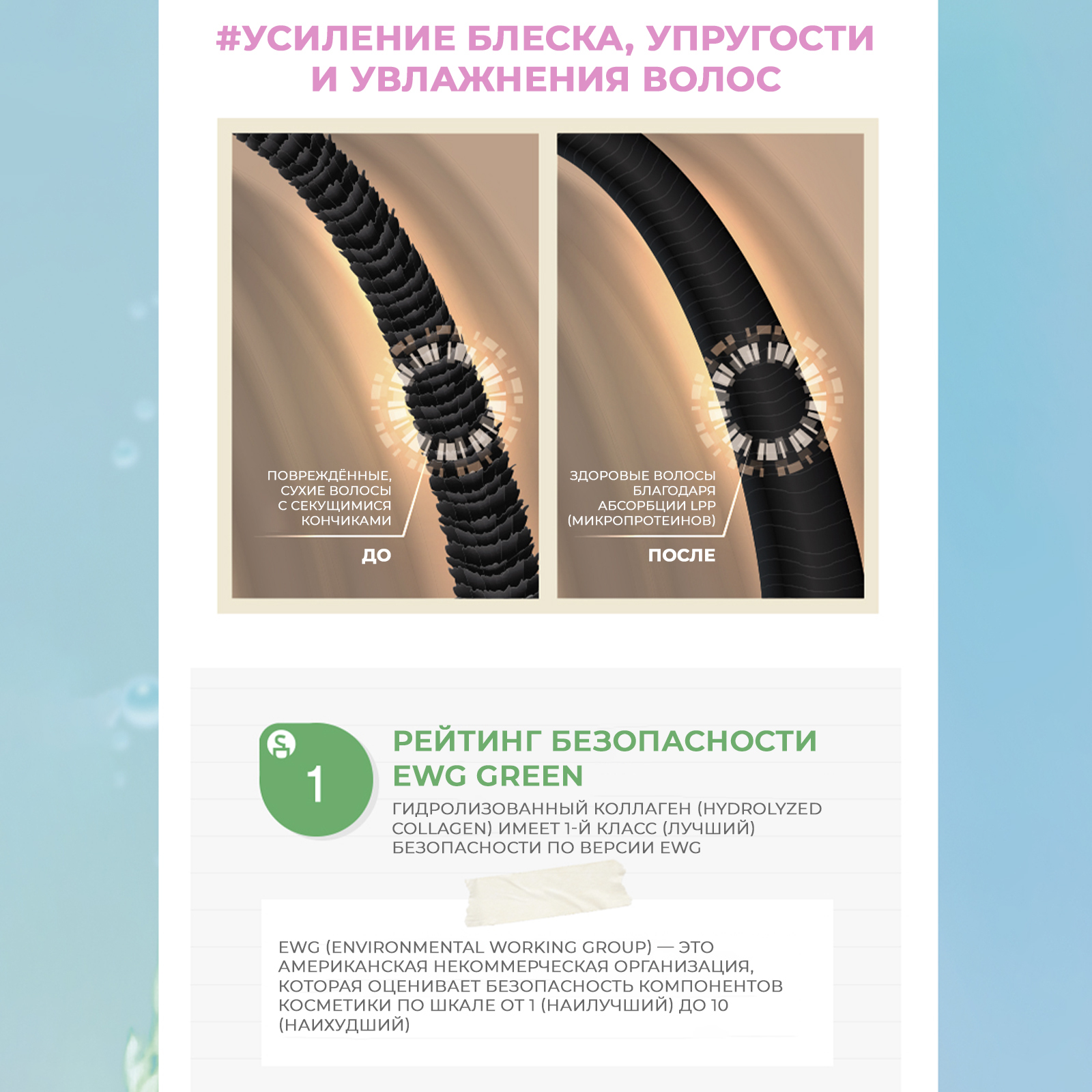 - Гидролизованный Коллаген увлажняет, успокаивает и снимает зуд, предотвращает сухость и шелушение, ускоряет процессы регенерации клеток и роста волос, восстанавливает гладкость и эластичность