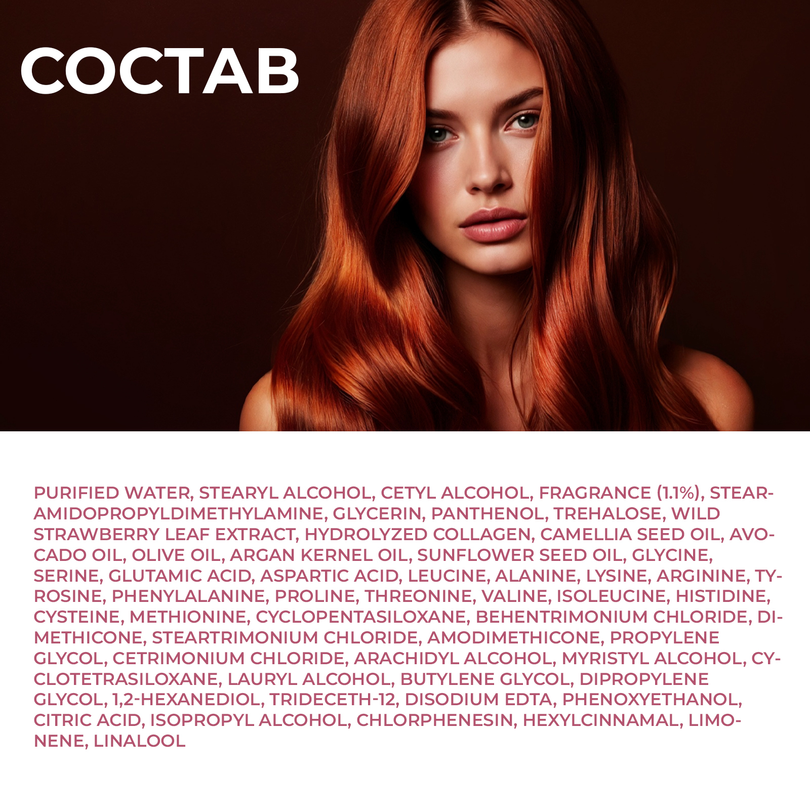 Состав: Purified water, stearyl alcohol, cetyl alcohol, fragrance (1.1%), stearamidopropyldimethylamine, glycerin, panthenol, trehalose, wild strawberry leaf extract, hydrolyzed collagen, camellia seed oil, avocado oil, olive oil, argan kernel oil, sunflower seed oil, glycine, serine, glutamic acid, aspartic acid, leucine, alanine, lysine, arginine, tyrosine, phenylalanine, proline, threonine, valine, isoleucine, histidine, cysteine, methionine, cyclopentasiloxane, behentrimonium chloride, dimethicone, steartrimonium chloride, amodimethicone, propylene glycol, cetrimonium chloride, arachidyl alcohol, myristyl alcohol, cyclotetrasiloxane, lauryl alcohol, butylene glycol, dipropylene glycol, 1,2-hexanediol, trideceth-12, disodium EDTA, phenoxyethanol, citric acid, isopropyl alcohol, chlorphenesin, hexylcinnamal, limonene, linalool