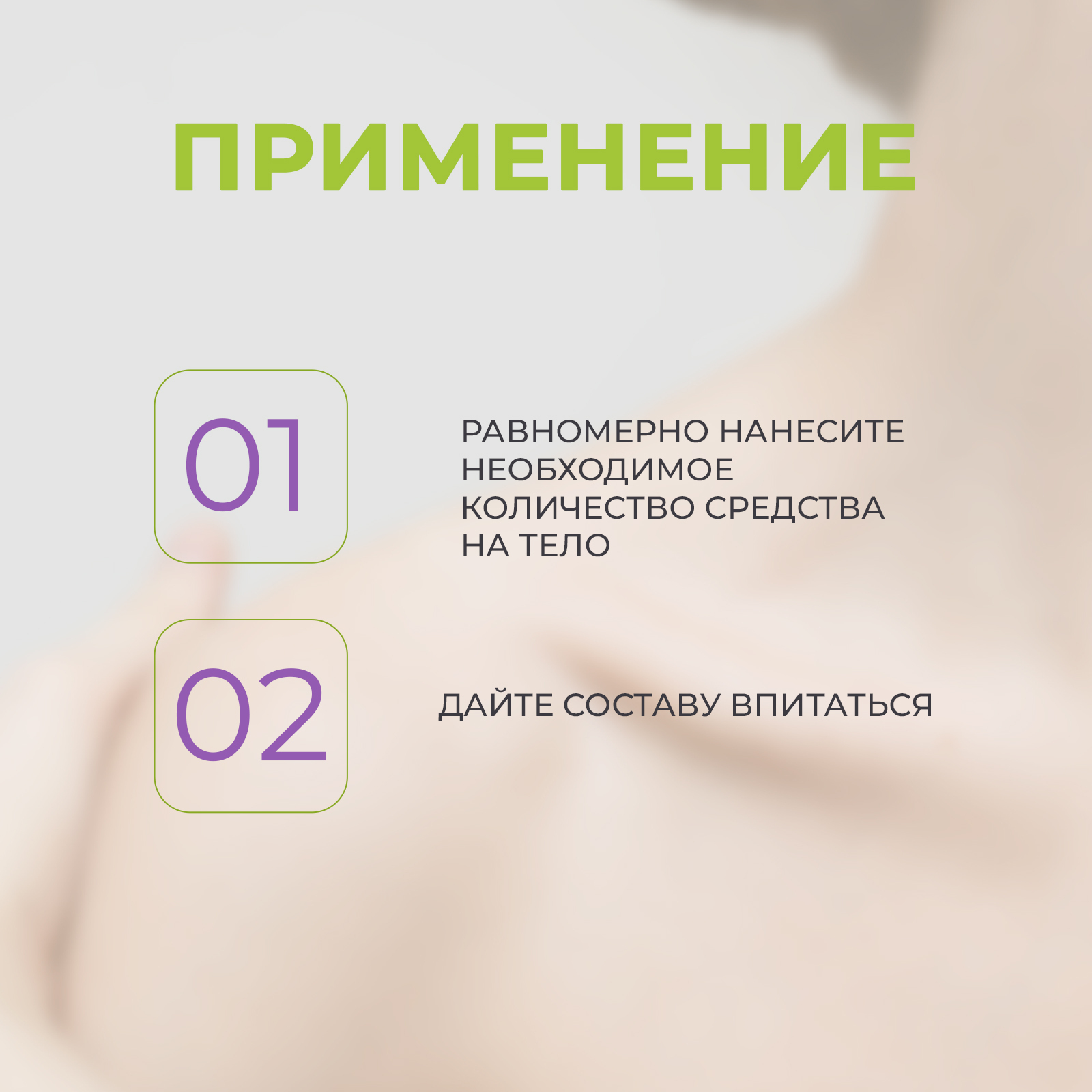 Способ применения: равномерно нанесите необходимое количество средства на тело, дайте составу впитаться