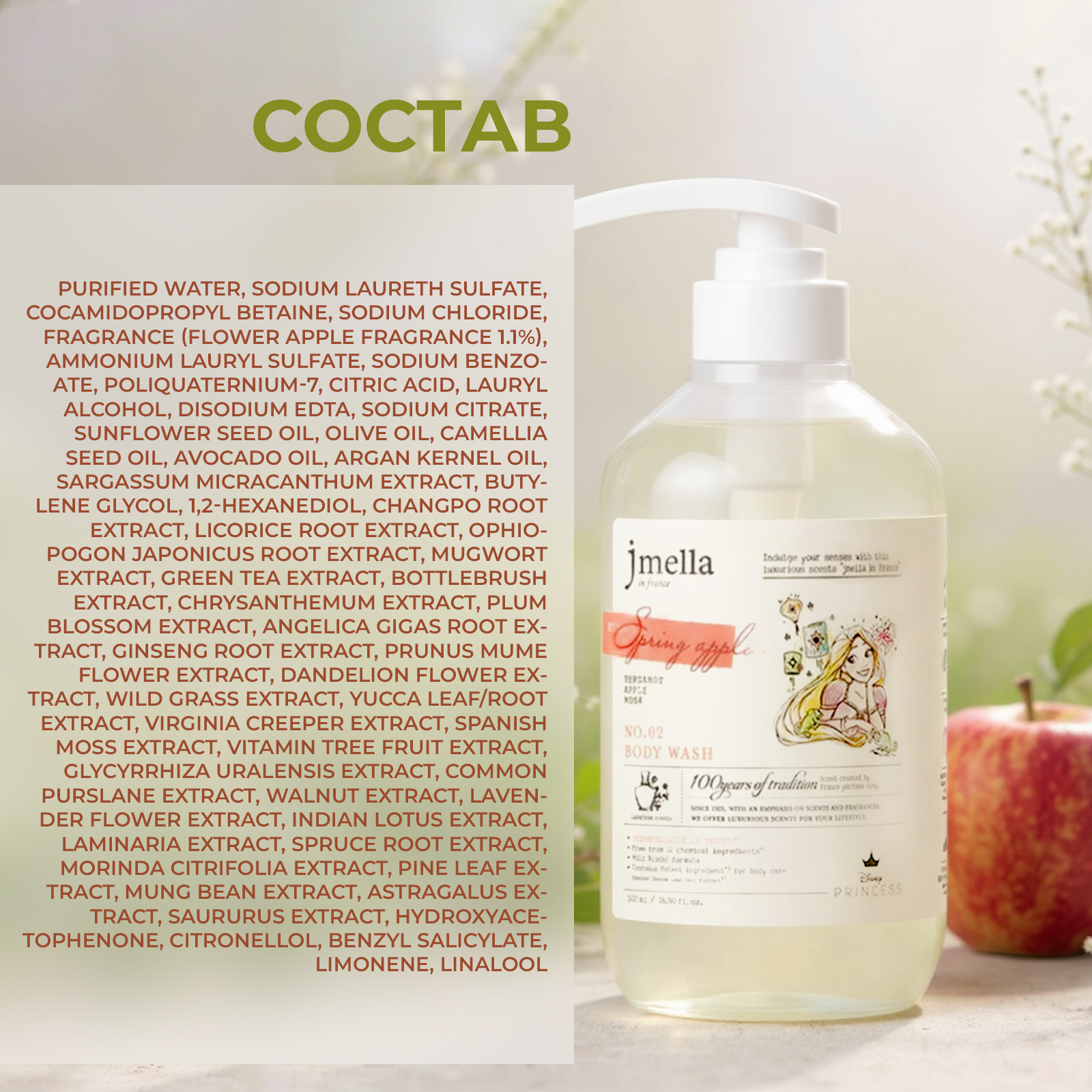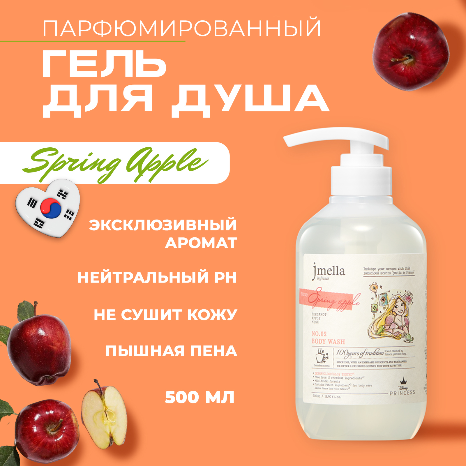 Деликатный гель для душа с нейтральным уровнем pH- 5,5 Jmella In France Disney Spring Apple Body Wash бережно очищает кожу и обладает пролонгированным увлажняющим действием. Содержит 30 растительных экстрактов и комплекс из 6 видов масел, предотвращает появление сухости и шелушений, питает и ухаживает за кожей. Содержит натуральные очищающие вещества и обладает тонким ароматом бергамота, яблока и мускуса. Гель протестирован дерматологами и подходит для всех типов кожи, включая чувствительную.
