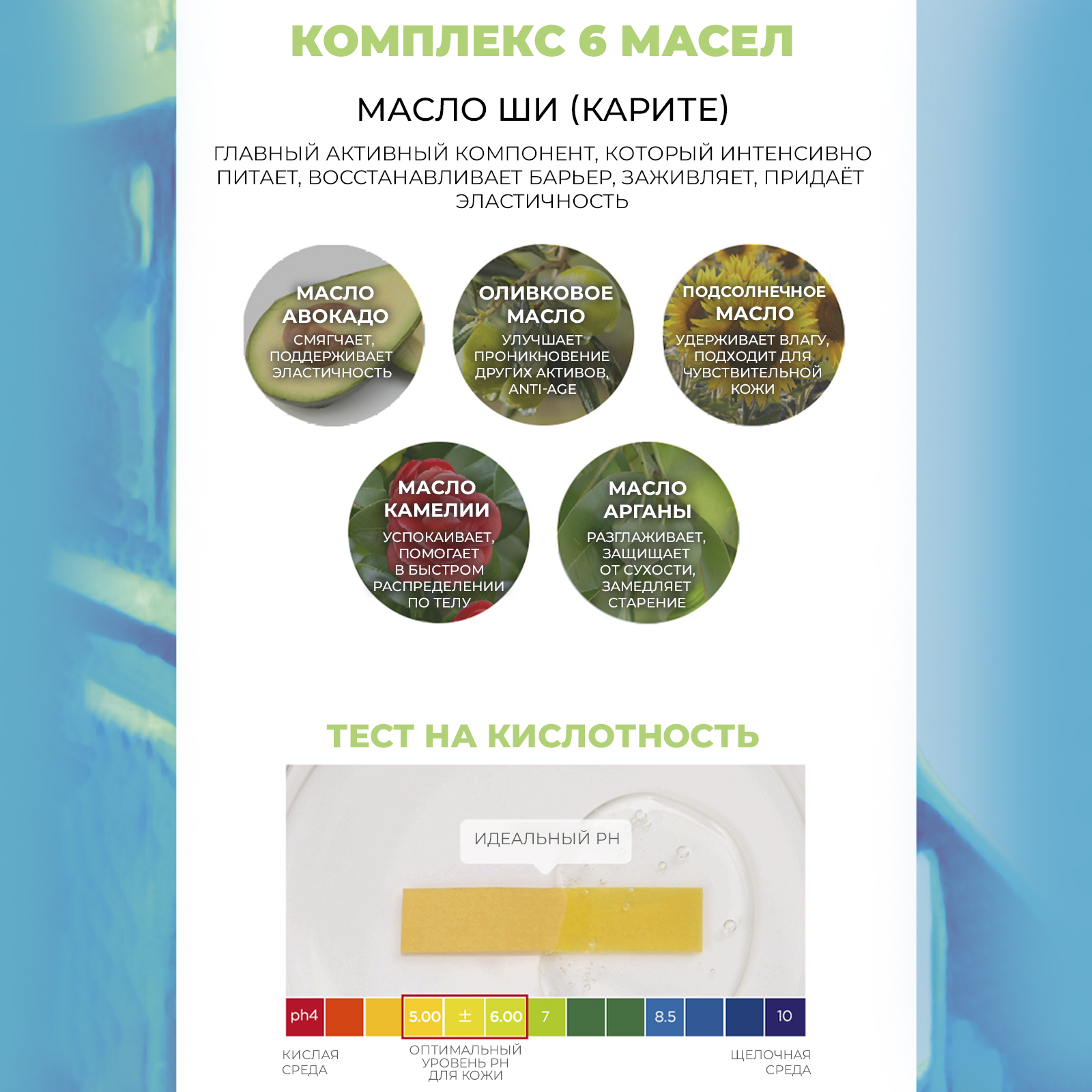 - Комплекс масел (Кокоса, Олива, Аргана, Авокадо, Камелия и Подсолнечник) выравнивает рельеф и тургор кожи, смягчает, питает, дарит гладкость и ухоженный вид