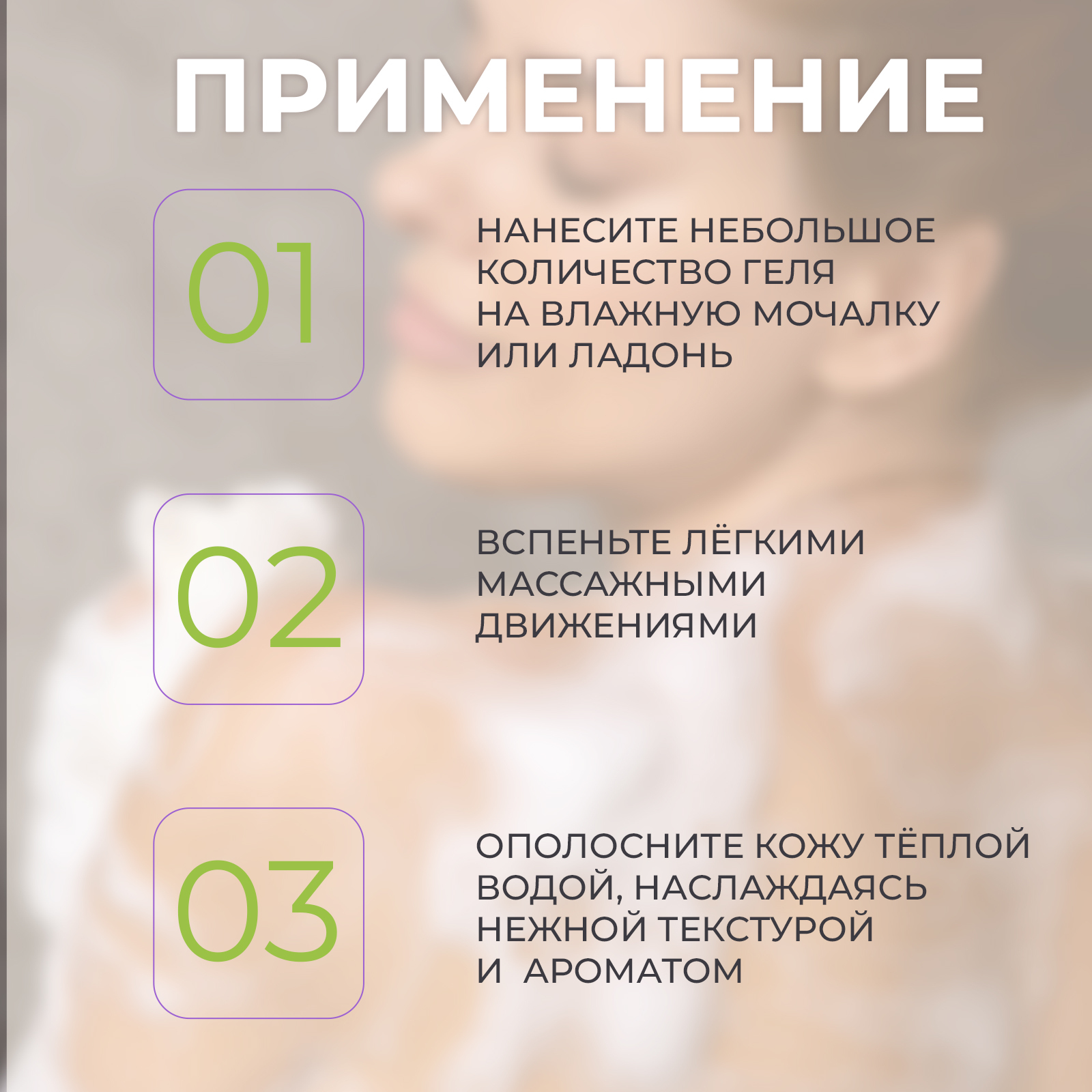 Способ применения: нанесите необходимое количество средства на влажную кожу, распределите по телу, смойте теплой водой.