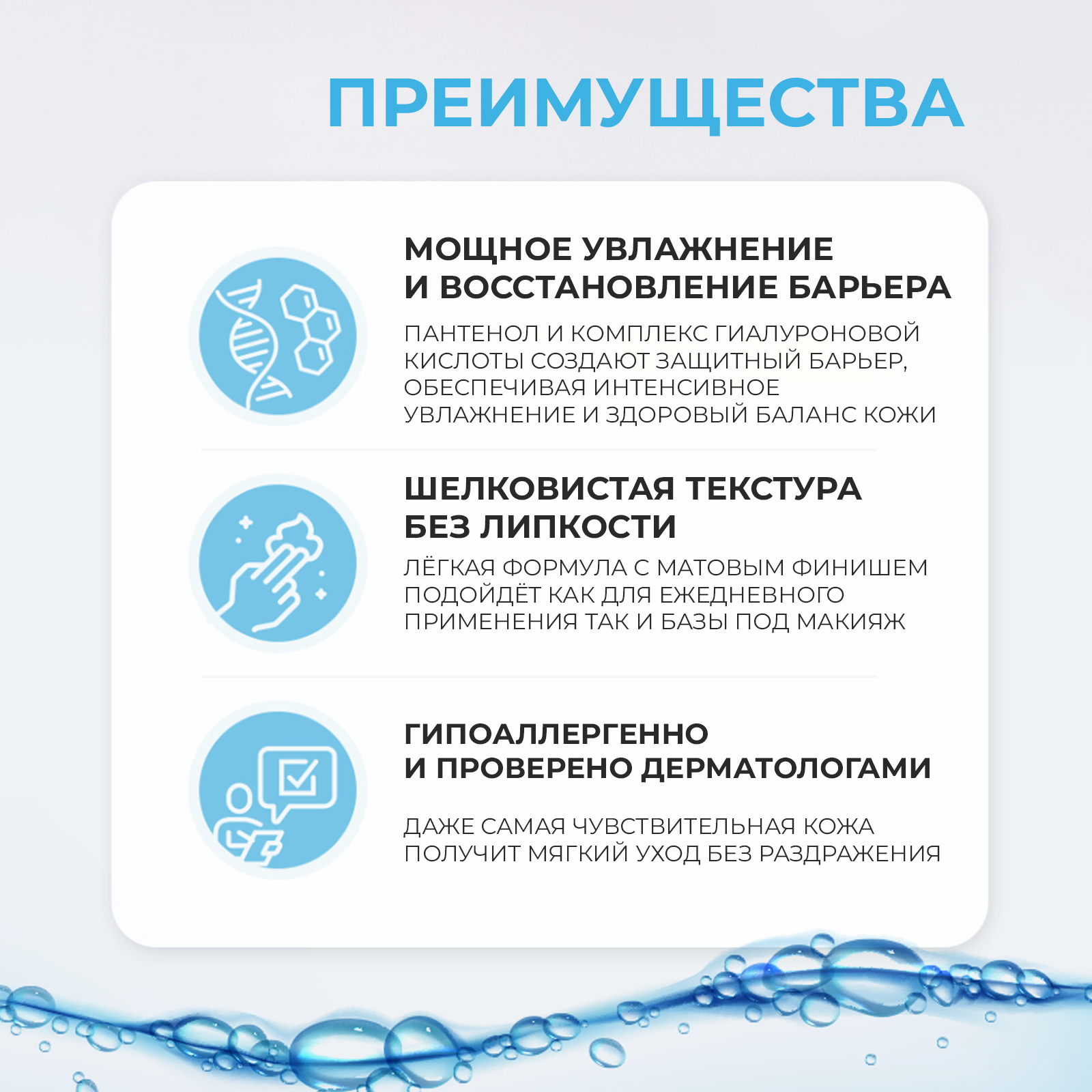 - Интенсивное увлажнение благодаря комплексу гиалуроновой кислоты