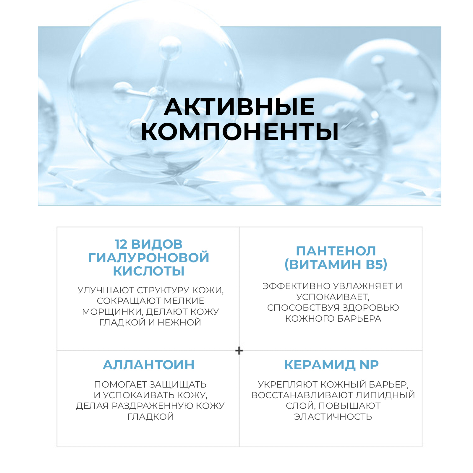 · Гиалуроновая кислота - интенсивно увлажняет кожу, притягивая и удерживая молекулы воды в её клетках, что обеспечивает глубокое и длительное увлажнение