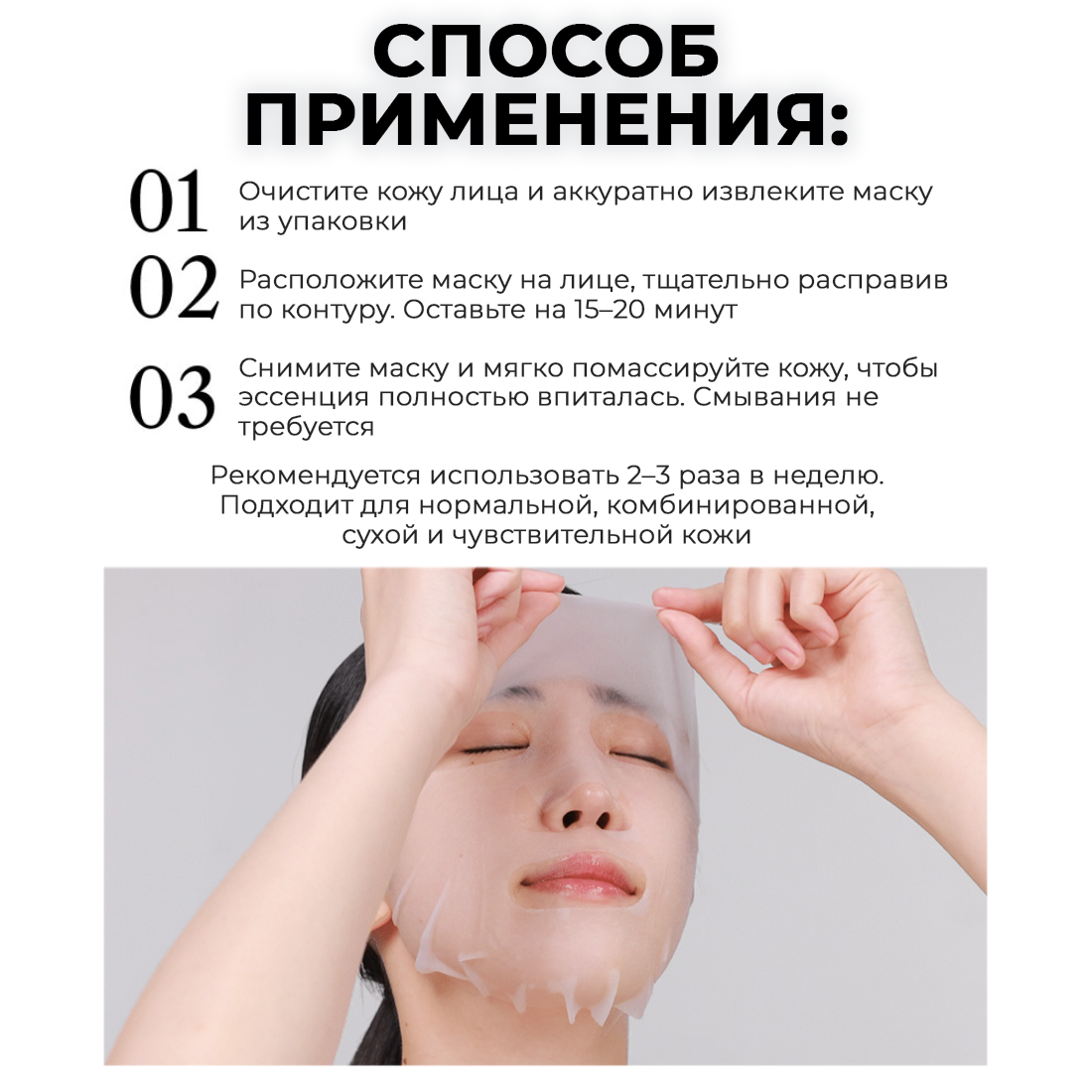 Способ применения: извлеките маску из упаковки. Затем расположите её на поверхности очищенной кожи и оставьте на 15-20 минут. Аккуратно снимите маску и легко помассируйте, чтобы увлажняющая сыворотка впиталась. Эссенция сыворотки не требует смывания. Для достижения лучшего эффекта рекомендуется повторять процедуру 2-3 раза в неделю. Подходит для всех типов кожи, особенно рекомендуется для чувствительной, тусклой и склонной к раздражению кожи.
