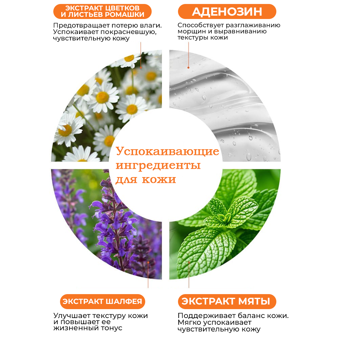Комплекс успокаивающих трав (ромашки, шалфея и мяты) – устраняет раздражение, дарит ощущение прохлады и помогает коже оставаться матовой в течение дня.