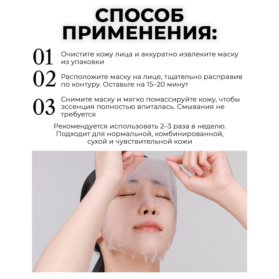 Способ применения: извлеките маску из упаковки. Затем расположите её на поверхности очищенной кожи и оставьте на 15-20 минут. Аккуратно снимите маску и легко помассируйте, чтобы увлажняющая сыворотка впиталась. Эссенция сыворотки не требует смывания. Для достижения лучшего эффекта рекомендуется повторять процедуру 2-3 раза в неделю. Подходит для тусклой, уставшей кожи с неровным тоном, а также для нормальной, комбинированной и обезвоженной кожи, нуждающейся в интенсивном увлажнении и осветлении.