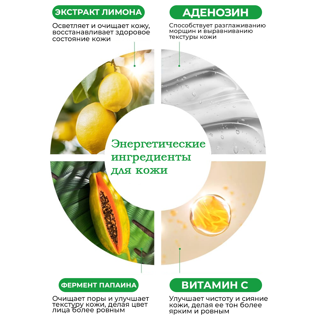 Фермент из папайи (Papain) – способствует мягкому обновлению верхнего слоя кожи, улучшая проникновение других активных веществ.