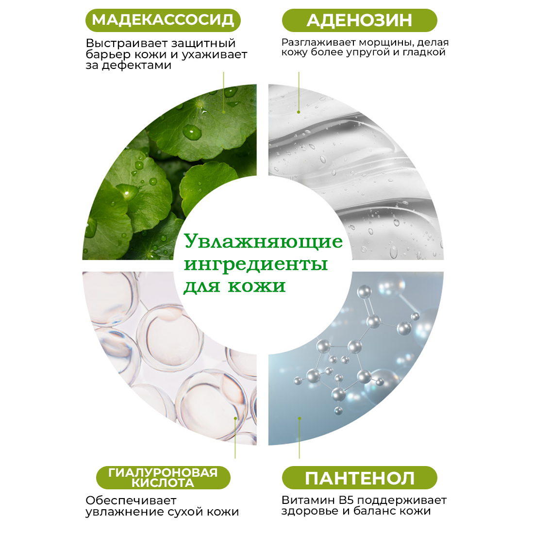 CICA-комплекс (Asiaticoside, Madecassic Acid, Madecassoside, Asiatic Acid) - усиленное успокоение и заживление. Эти компоненты являются ключевыми биоактивными веществами Центеллы, отвечающими за противовоспалительное и восстанавливающее действие.