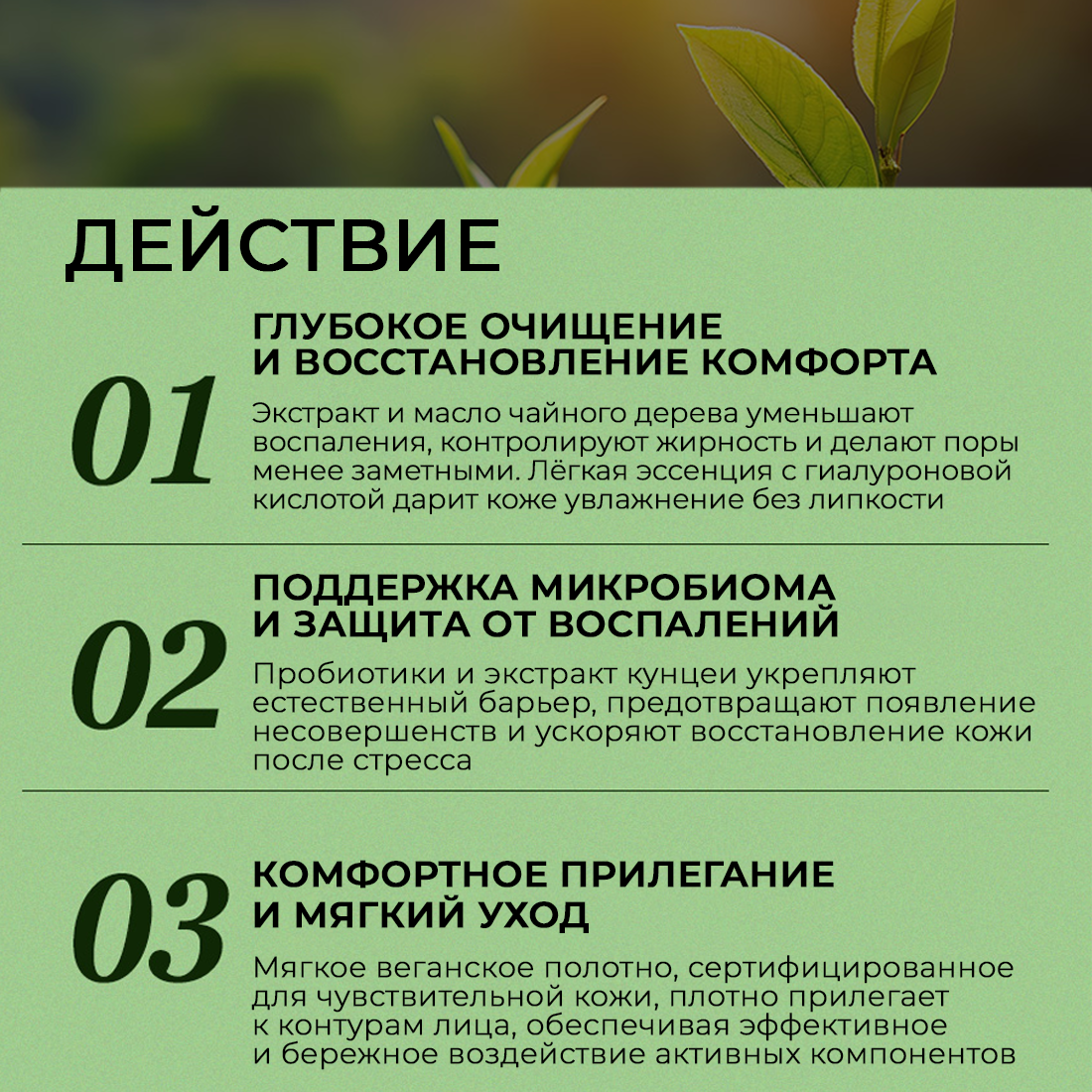 Экстракт Кунцеи (Kunzea Ericoides Leaf Extract) - действует синергично с чайным деревом, обеспечивая дополнительную очищающую и антисептическую поддержку, что идеально для борьбы с несовершенствами.