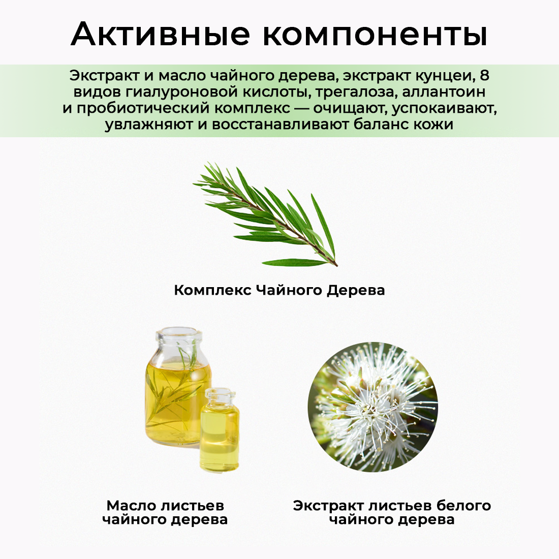 Экстракт и Масло Чайного Дерева - эффективно подавляют рост бактерий, вызывающих акне, быстро снижают реактивность кожи, успокаивают очаги воспаления и оказывают матирующий эффект.