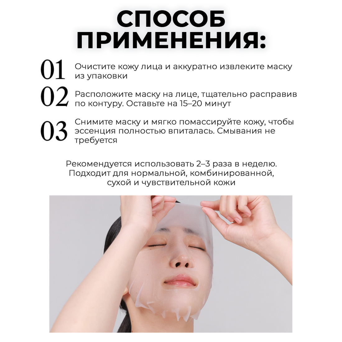 Способ применения: извлеките маску из упаковки. Затем расположите её на поверхности очищенной кожи и оставьте на 15-20 минут. Аккуратно снимите маску и легко помассируйте, чтобы увлажняющая сыворотка впиталась. Эссенция сыворотки не требует смывания. Для достижения лучшего эффекта рекомендуется повторять процедуру 2-3 раза в неделю. Подходит для жирной, комбинированной, чувствительной кожи и кожи, склонной к акне.