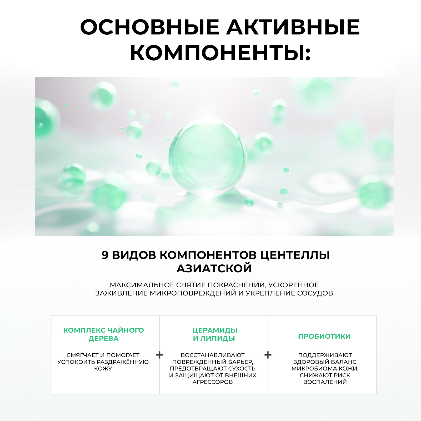 Состав: Water, Butylene Glycol, Glycerin, Dipropylene Glycol, Methylpropanediol, Betaine, Allantoin, Hydroxyethyl Urea, Arginine, Panthenol, 1,2-Hexanediol, Ethylhexylglycerin, Phenoxyethanol, Carbomer, Xanthan Gum, PEG-60 Hydrogenated Castor Oil, Disodium EDTA, Fragrance, Glyceryl Glucoside, Dipotassium Glycyrrhizate, Gluconolactone, Caprylic/Capric Triglyceride, Centella Asiatica Leaf Water, Hydrogenated Phosphatidylcholine, Centella Asiatica Extract, Sucrose Stearate, Sea Water, Melaleuca Alternifolia (Tea Tree) Leaf Extract, Kunzea Ericoides Leaf Extract, Centella Asiatica Leaf Extract, Centella Asiatica Root Extract, Centella Asiatica Leaf/Stem Extract, Ulmus Campestris (Elm) Bark Extract, Glycine Max (Soybean) Seed Extract, Stearic Acid, Hexyl Laurate, Cetearyl Alcohol, Anastatica Hierochuntica Extract, Beta-Glucan, Palmitic Acid, Ceramide NP, Bacillus Ferment, Lactobacilus Ferment, Aspergillus Ferment, Cholesterol, Glycosphingolipids, Asiaticoside, Madecassic Acid, Madecassoside, Asiatic Acid, Thiamine HCL, Riboflavin, Niacinamide, Pyridoxine HCl, Biotin, Folic Acid, Cyanocobalamin, Ascorbic Acid, Sodium Ascorbyl Phosphate, Tocopherol.
