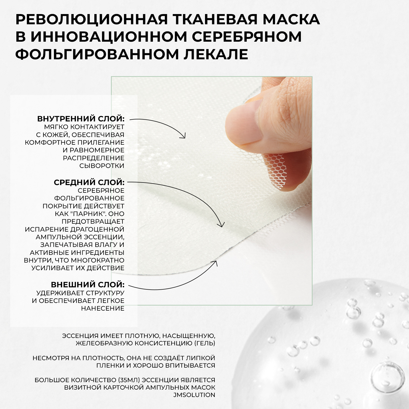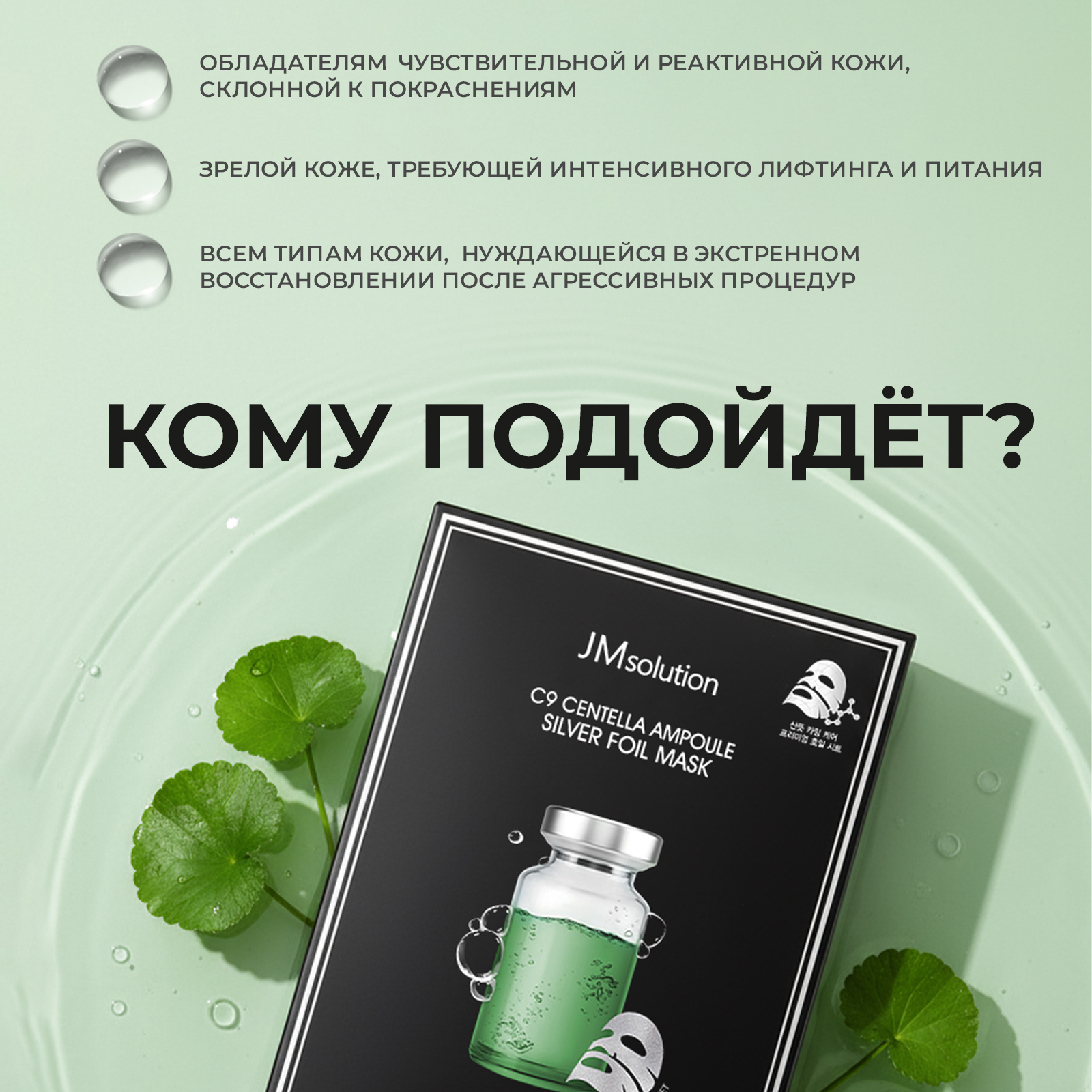 Революционная тканевая маска JMSOLUTION C9 CENTELLA AMPOULE SILVER FOIL MASK в инновационном серебряном фольгированном лекале, насыщенная мощным комплексом 9 видов Центеллы Азиатской (Cica) и витаминами. Обеспечивает мгновенное успокоение, глубокое восстановление барьера и интенсивное антивозрастное действие. Идеально для чувствительной, раздраженной и возрастной кожи. Мы взяли успокаивающую силу Центеллы Азиатской и усилили ее до девятикратной концентрации, используя различные формы экстракта: