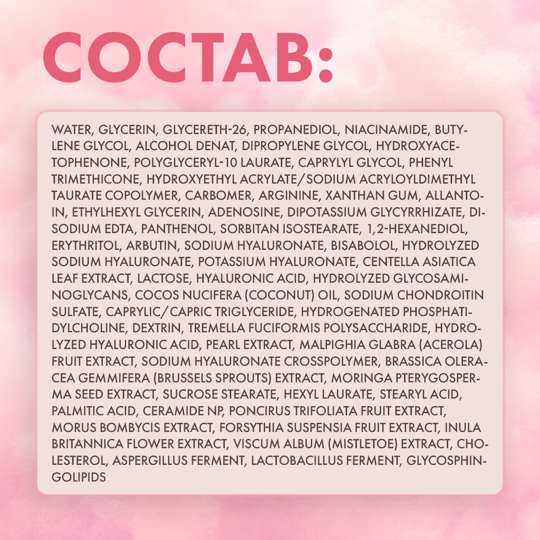 Состав: Water, Glycerin, Glycereth-26, Propanediol, Niacinamide, Butylene Glycol, Alcohol Denat, Dipropylene Glycol, Hydroxyacetophenone, Polyglyceryl-10 Laurate, Caprylyl Glycol, Phenyl Trimethicone, Hydroxyethyl Acrylate/Sodium Acrylloyldimethyl Taurate Copolymer, Carbomer, Arginine, Xanthan Gum, Allantoin, Ethylhexylglycerin, Adenosine, Caprylic/Capric Triglyceride, Hydrogenated Phosphatidylcholine, Dextrin, Tremella Fuciformis Polysaccharide, Dipotassium Glycyrrhizate, Disodium Edta, Panthenol, Sorbitan Isostearate, 1,2-Hexanediol, Erythritol, Arbutin, Sodium Lactose, Hyaluronic Acid, Hydrolyzed Glycosaminoglycans, Cocos Nucifera (Coconut) Oil, Sodium Chondroitin Sulfate, Hydrolyzed Hyaluronic Acid, Pearl Extract, Malpighia Glabra (Acerola) Fruit Extract, Sodium Hyaluronate, Bisabolol, Hydrolyzed Sodium Hyaluronate, Potassium Hyaluronate, Centella Asiatica Leaf Extract, Hydroxyacetophenone, Polyglyceryl-10 Laurate, Caprylyl Glycol, Phenyl Trimethicone, Hydroxyethyl Acrylate/Sodium Acrylloyldimethyl Taurate Copolymer, Brassica Oleracea Gemmifera (Brussels Sprouts) Extract, Moringa Pterygosperma Seed Extract, Sucrose Stearate, Hexyl Laurate, Stearic Acid, Palmitic Acid, Ceramide Np, Poncirus Trifoliata Fruit Extract, Morus Bombycis Extract, Forsythia Suspensa Fruit Extract, Inula Britannica Flower Extract, Viscum Album (Mistletoe) Extract, Cholesterol, Aspergillus Ferment, Lactobacillus Ferment, Glycosphingolipids.