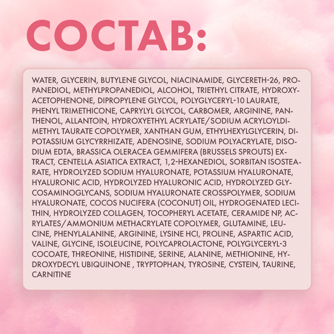 Состав: Water, Glycerin, Niacinamide, Glycereth-26, Propanediol, Butylene Glycol, Methylpropanediol, Alcohol Denat, Dipropylene Glycol, Hydroxyacetophenone, Polyglyceryl-10 Laurate, Phenyl Trimethicone, Allantoin, Caprylyl Glycol, Arginine, Carbomer, Panthenol, Bis-Ethoxydiglycol Cyclohexane 1,4-Dicarboxylate, Xanthan Gum, Hydroxyethyl Acrylate/Sodium Acryloyldimethyl Taurate Copolymer, Ethylhexylglycerin, Adenosine, Dipotassium Glycyrrhizate, Disodium Edta, Sodium Polyacrylate, Sorbitan Isostearate, 1,2-Hexanediol, Centella Asiatica Leaf Extract, Cocos Nucifera (Coconut) Oil, Caprylic/Capric Triglyceride, Hydrogenated Phosphatidylcholine, Sea Water, Hydrolyzed Collagen, Brassica Oleracea Gemmifera (Brussels Sprouts) Extract, Sucrose Stearate, Hexyl Laurate, Stearic Acid, Ulmus Campestris (Elm) Bark Extract, Glycine Max (Soybean) Seed Extract, Palmitic Acid, Ceramide Np, Glutamine, Leucine, Phenylalanine, Lysine Hcl, Proline, Aspartic Acid, Valine, Glycine, Isoleucine, Aspergillus Ferment, Bacillus Ferment, Lactobacillus Ferment, Threonine, Histidine, Serine, Alanine, Methionine, Tryptophan, Tyrosine, Cholesterol, Glycosphingolipids, Cysteine, Taurine, Carnitine.