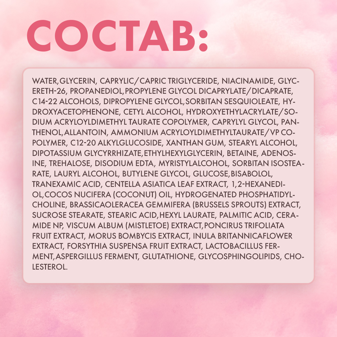 Состав: Water, Glycerin, Caprylic/Capric Triglyceride, Niacinamide, Glycereth-26, Propanediol, Propylene Glycol Dicaprylate/Dicaprate, C14-22 Alcohols, Dipropylene Glycol, Sorbitan Sesquioleate, Hydroxyacetophenone, Cetyl Alcohol, Hydroxyethyl Acrylate/Sodium Acryloyldimethyl Taurate Copolymer, Caprylyl Glycol, Panthenol, Allantoin, Ammonium Acryloyldimethyltaurate/VP Copolymer, C12-20 Alkyl Glucoside, Xanthan Gum, Stearyl Alcohol, Dipotassium Glycyrrhizate, Ethylhexylglycerin, Betaine, Adenosine, Trehalose, Disodium EDTA, Myristyl Alcohol, Sorbitan Isostearate, Lauryl Alcohol, Butylene Glycol, Glucose, Bisabolol, Tranexamic Acid, Centella Asiatica Leaf Extract, 1,2-Hexanediol, Cocos Nucifera (Coconut) Oil, Hydrogenated Phosphatidylcholine, Brassica Oleracea Gemmifera (Brussels Sprouts) Extract, Sucrose Stearate, Stearic Acid, Hexyl Laurate, Palmitic Acid, Ceramide NP, Viscum Album (Mistletoe) Extract, Poncirus Trifoliata Fruit Extract, Morus Bombycis Extract, Inula Britannica Flower Extract, Forsythia Suspensa Fruit Extract, Lactobacillus Ferment, Aspergillus Ferment, Glutathione, Glycosphingolipids, Cholesterol.