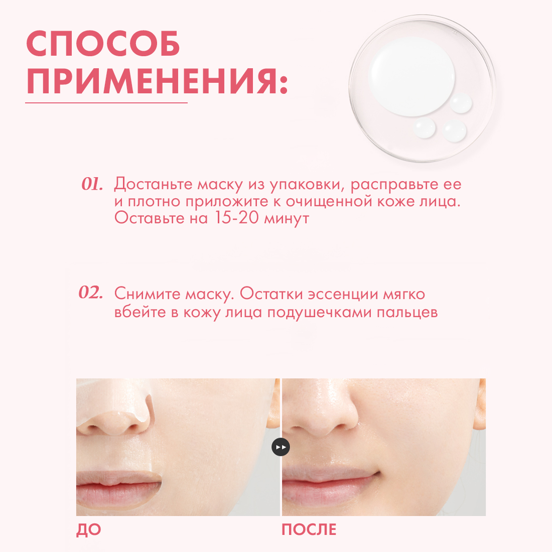Применение: Извлеките маску из упаковки. Затем расположите маску на поверхности очищенной, тонизированной кожи и оставьте на 15-20 минут. Аккуратно снимите маску и легко помассируйте, чтобы увлажняющая сыворотка впиталась. Не требует смывания. Для достижения лучшего эффекта рекомендуется повторять процедуру 3 раза в неделю. При обнаружении чувствительности к компонентам прекратить использование. Маска предназначена для одноразового применения.