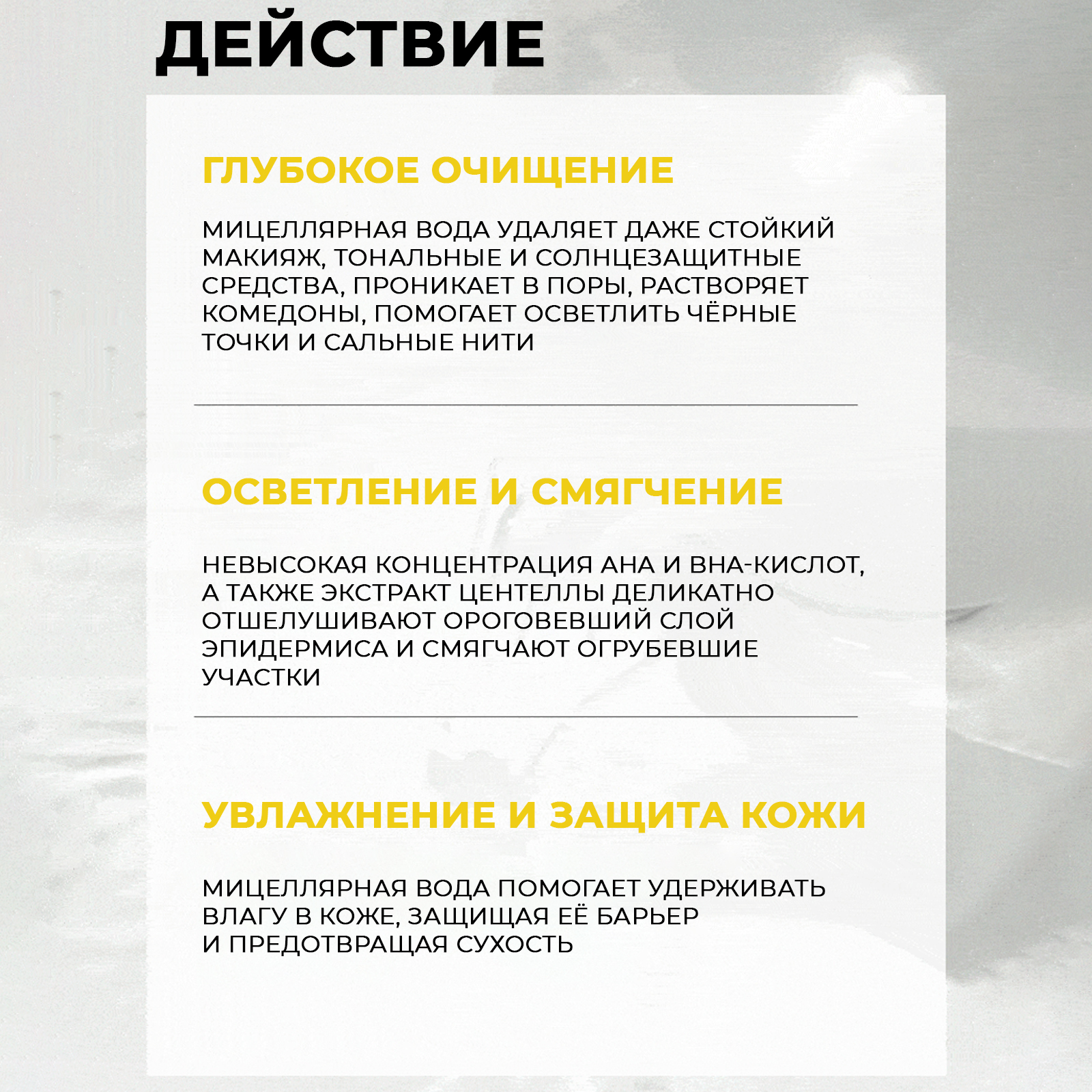 - Экстракт центеллы способствует заживлению повреждений, повышает уровень увлажнения, успокаивает, снимает воспаление и признаки чувствительности кожи.