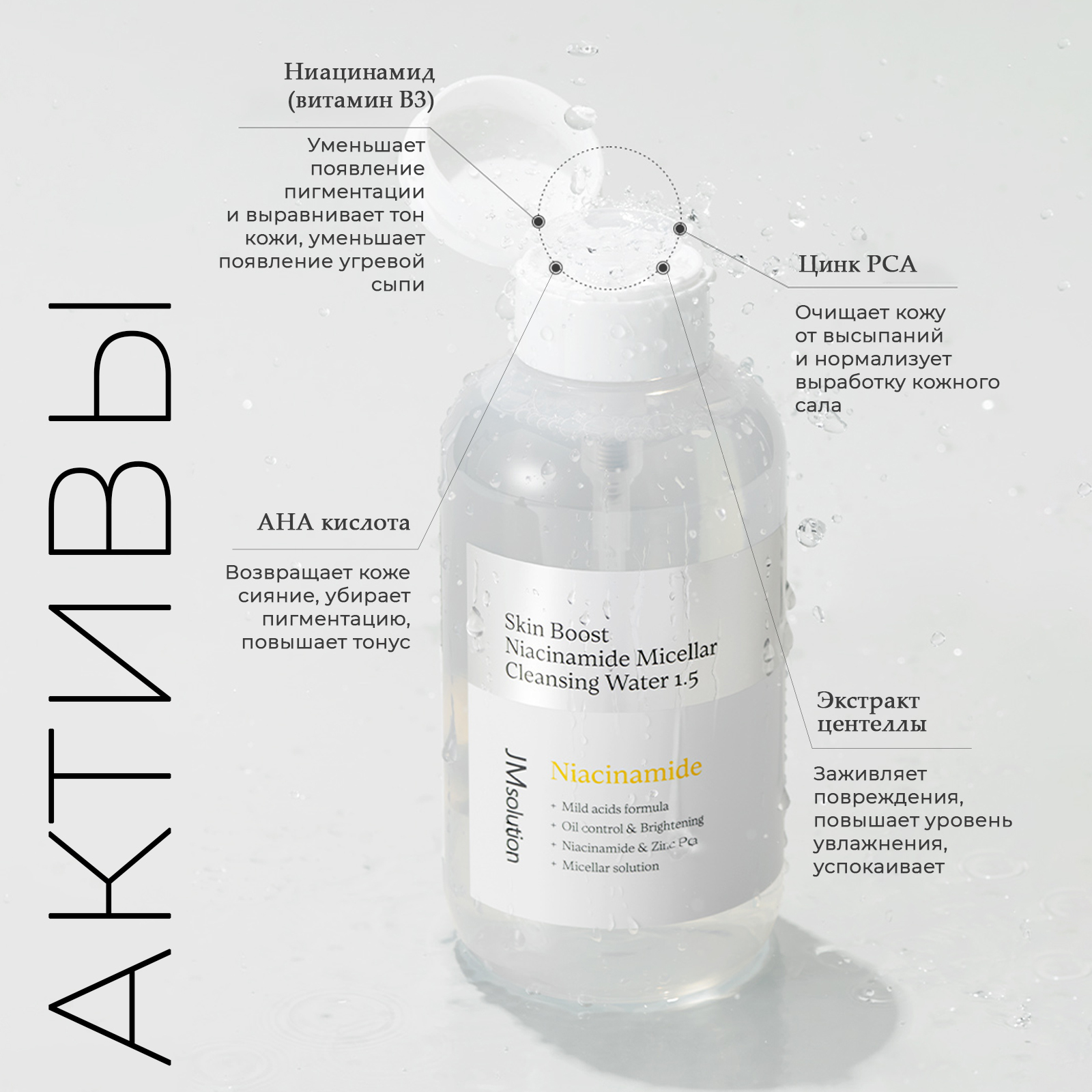 Очищающая вода JMsolution Skin Boost Niacinamide Micellar Cleansing Water с ниацинамидом и комплексом АНА ВНА кислот. Глубоко очищает, удаляет даже стойкий макияж, тональные и солнцезащитные средства. Проникает в поры, растворяет комедоны и излишки кожного сала, помогает осветлить чёрные точки и сальные нити. Невысокая концентрация AHA и BHA-кислот, а также экстракт центеллы деликатно отшелушивают ороговевший слой эпидермиса и смягчают огрубевшие участки. Стимулируют процессы регенерации и обновления, мягко осветляют и выравнивают общий тон. Способствуют заживлению воспалений без следов постакне. Средство с pH 5 помогает поддерживать естественный уровень pH кожи, способствуя здоровью и увлажнению кожи.