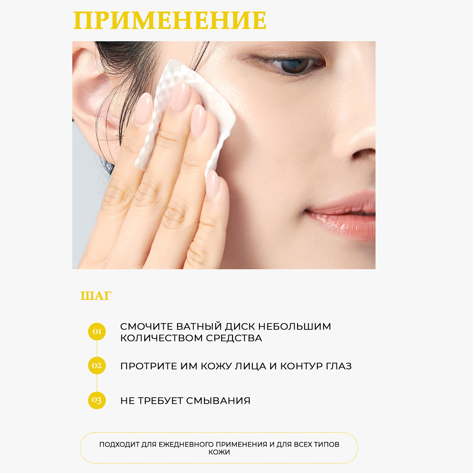 Способ применения: Смочите ватный диск и протрите кожу лица и контура глаз. Подходит для ежедневного применения. Не требует смывания. Подходит для всех типов кожи.