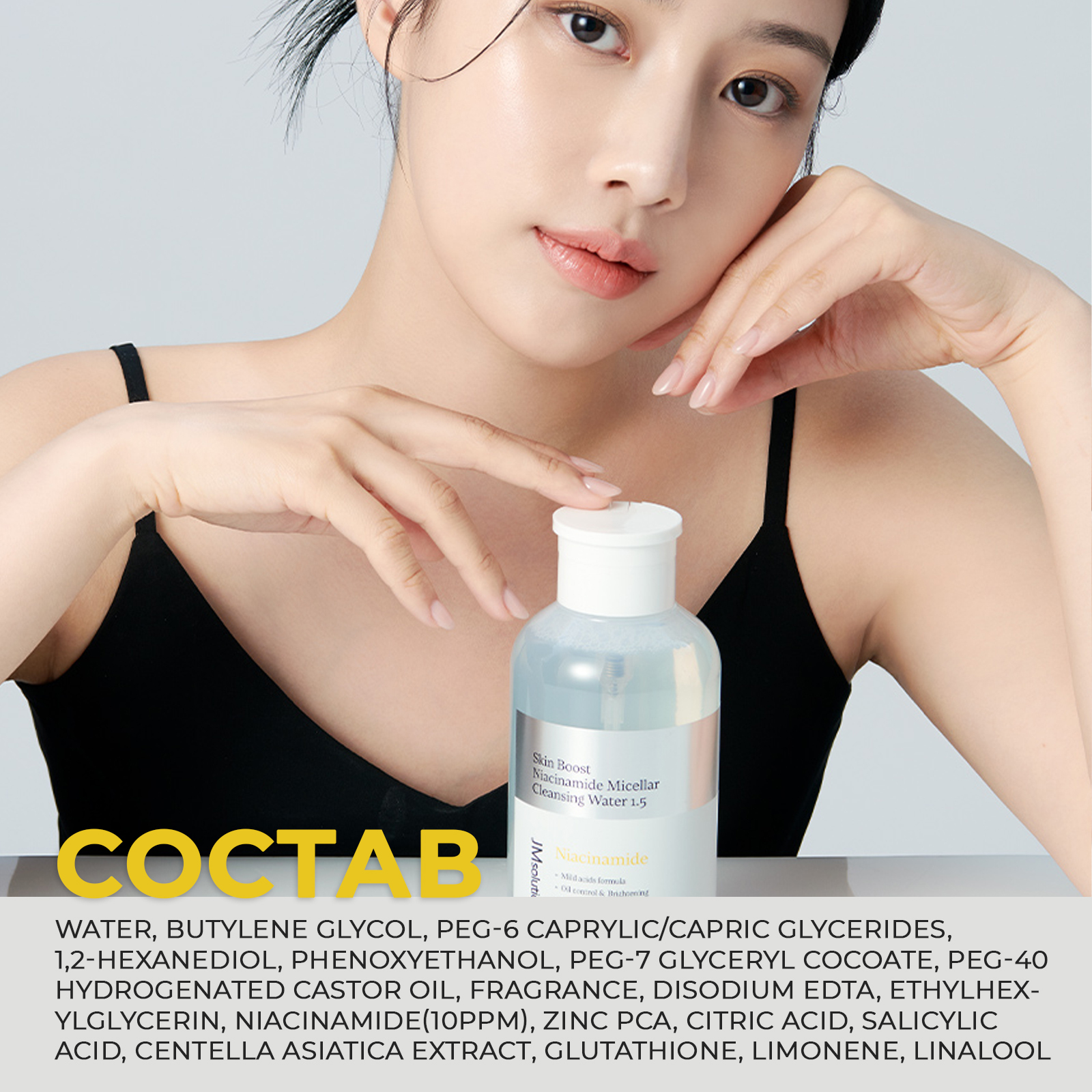 Состав: Water, Butylene Glycol, PEG-6 Caprylic/Capric Glycerides, 1,2-Hexanediol, Phenoxyethanol, PEG-7 Glyceryl Cocoate, PEG-40 Hydrogenated Castor Oil, Fragrance, Disodium EDTA, Ethylhexylglycerin, Niacinamide(10PPM), Zinc PCA, Citric Acid, Salicylic Acid, Centella Asiatica Extract, Glutathione, Limonene, Linalool