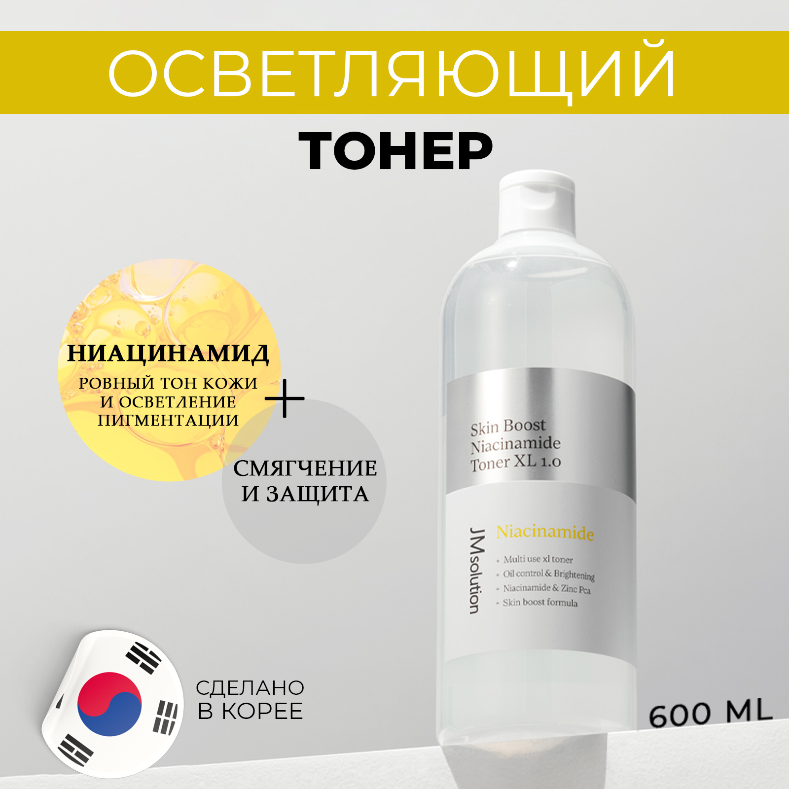 Осветляющий тонер JMsolution Skin Boost Niacinamide Toner с ниацинамидом и комплексом АНА PНА кислот. Глубоко увлажняет, осветляет тон и придает коже мягкое сияние. Укрепляет иммунитет кожи, улучшает ее защитные функции, стимулирует процессы заживления и обновления. Ниацинамид способствует улучшению текстуры кожи, уменьшению пигментации, уменьшению воспалений и увеличению упругости кожи. Невысокая концентрация AHA и PHA-кислот, а также экстракт центеллы деликатно отшелушивают ороговевший слой эпидермиса и смягчают огрубевшие участки. Стимулируют процессы регенерации и обновления, мягко осветляют и выравнивают общий тон. Способствуют заживлению воспалений без следов постакне. Средство с pH 5 помогает поддерживать естественный уровень pH кожи, способствуя здоровью и увлажнению кожи.