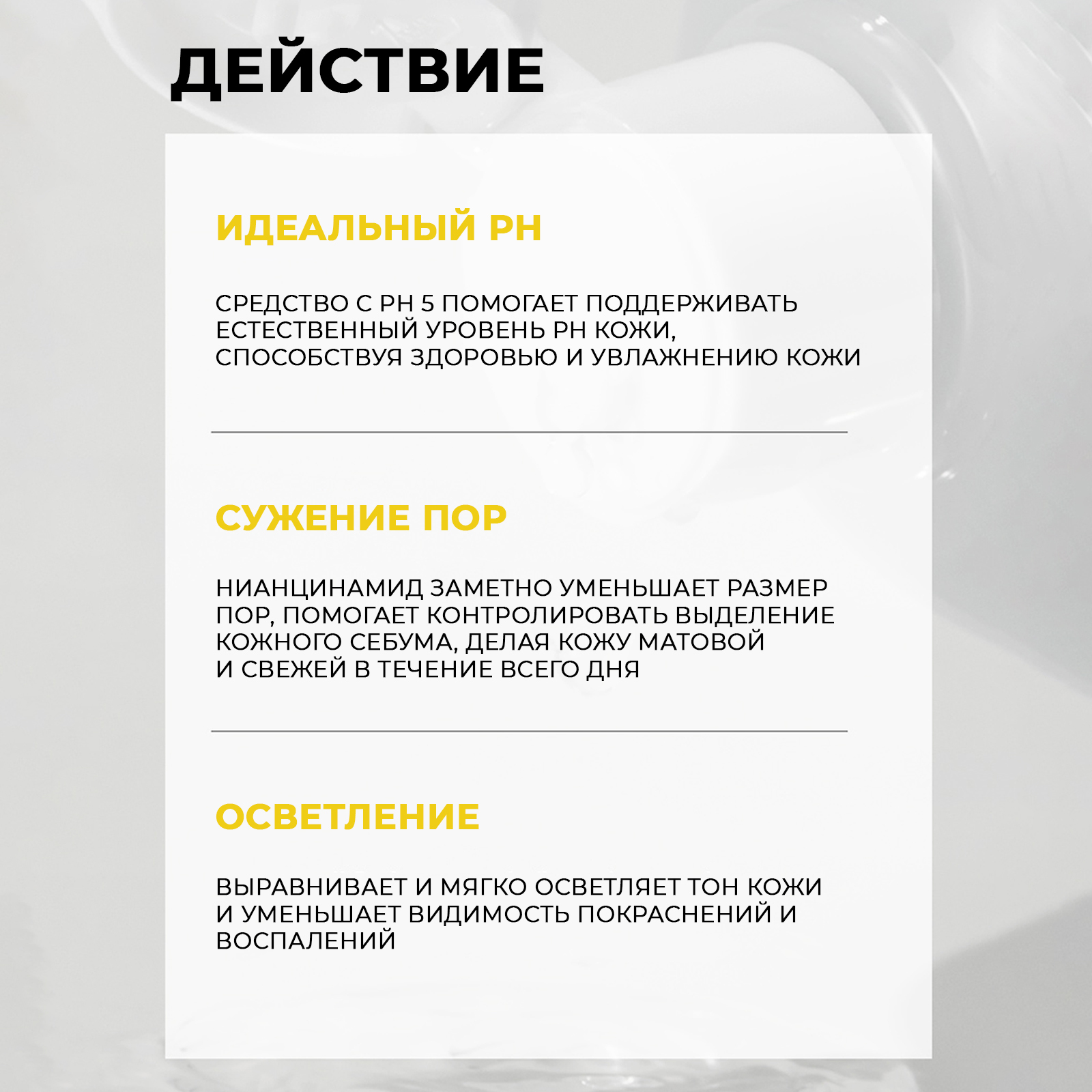 - Ниацинамид (витамин В3) помогает улучшить текстуру кожи, уменьшить появление пигментации и выровнять тон кожи. Также обладает противовоспалительными свойствами и способствует уменьшению появления угревой сыпи.