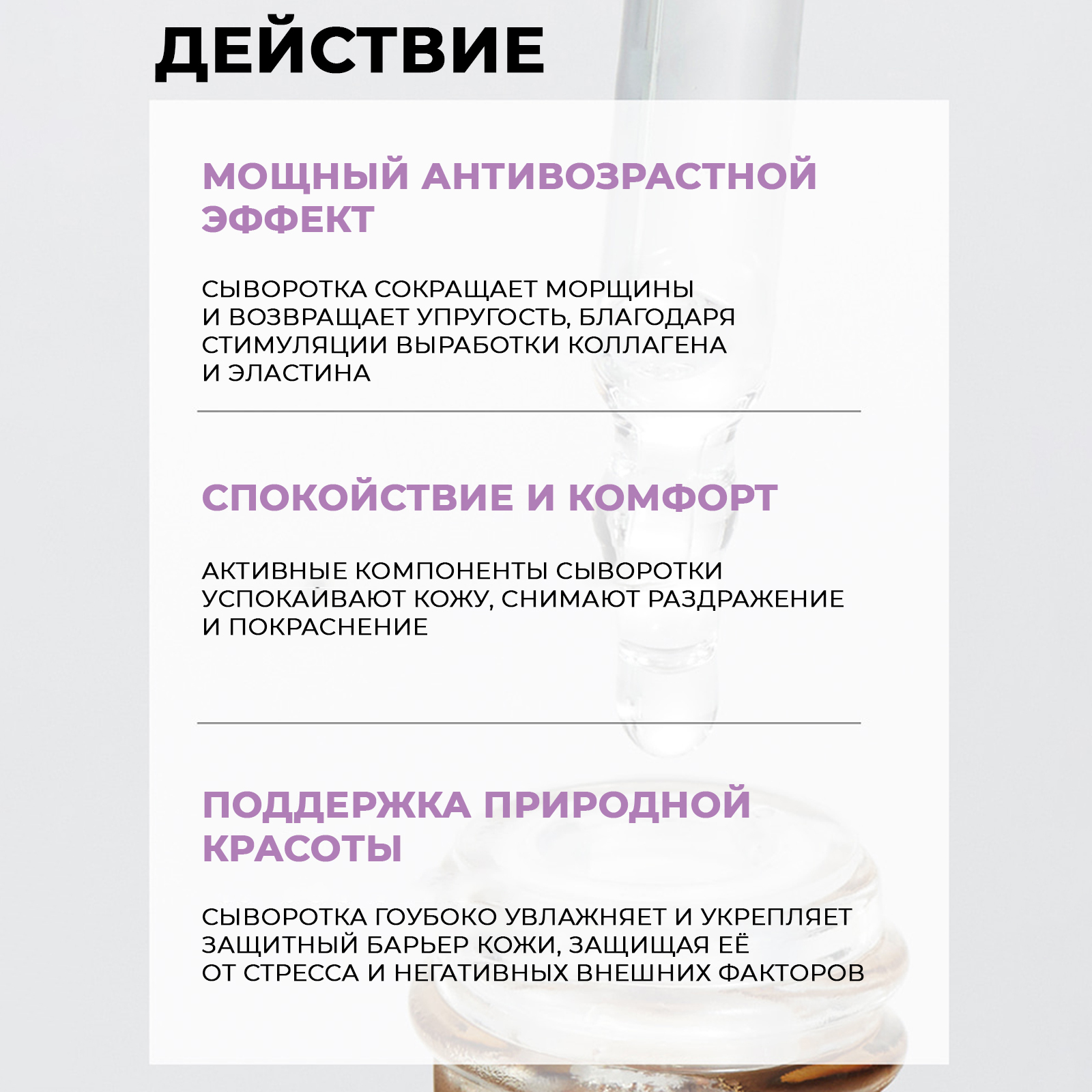 Способ применения: нанесите несколько капель средства на предварительно очищенную и тонизированную кожу лица, завершающим этапом ухода нанесите крем. Подходит для всех типов кожи. Подходит для использования в утреннем и вечернем уходе.