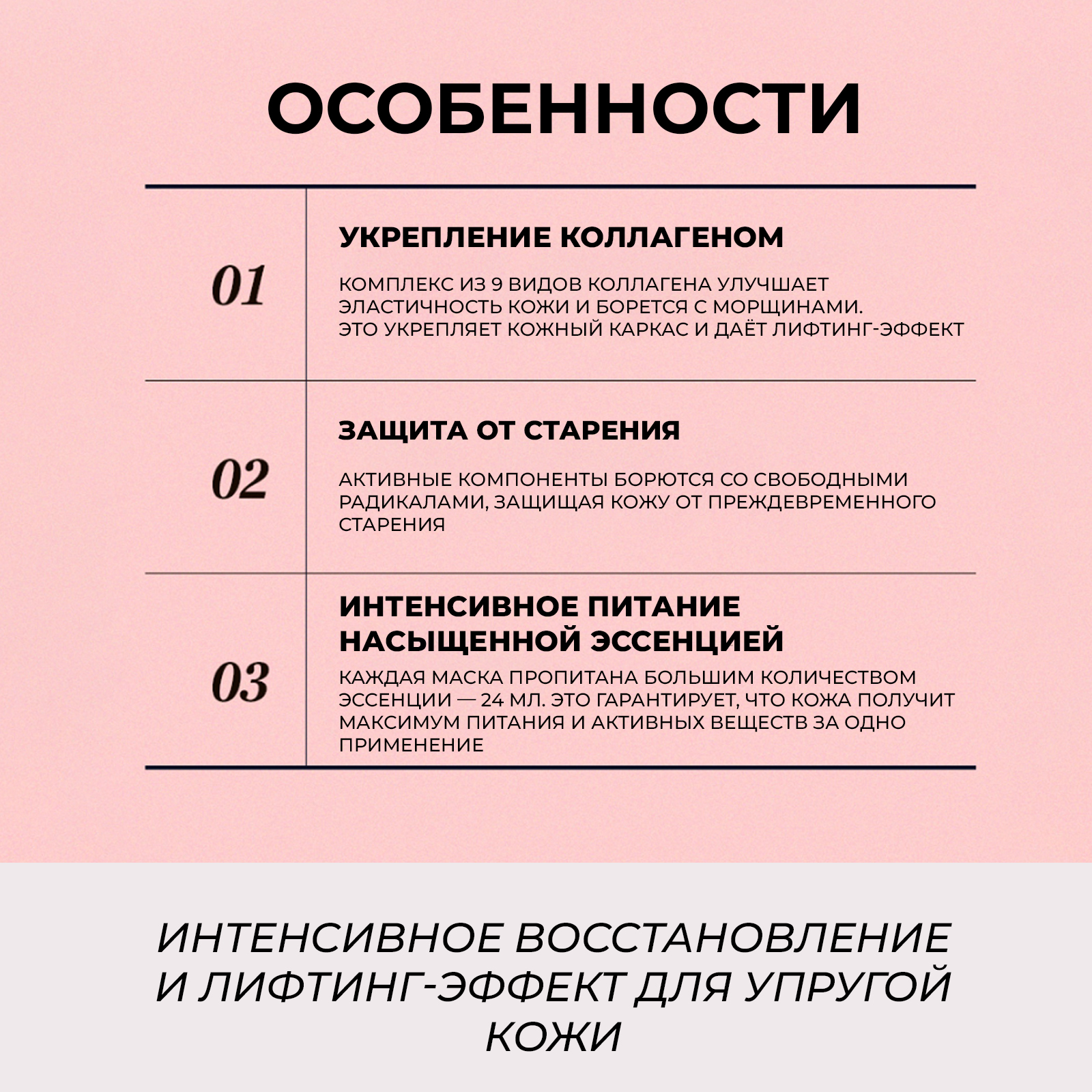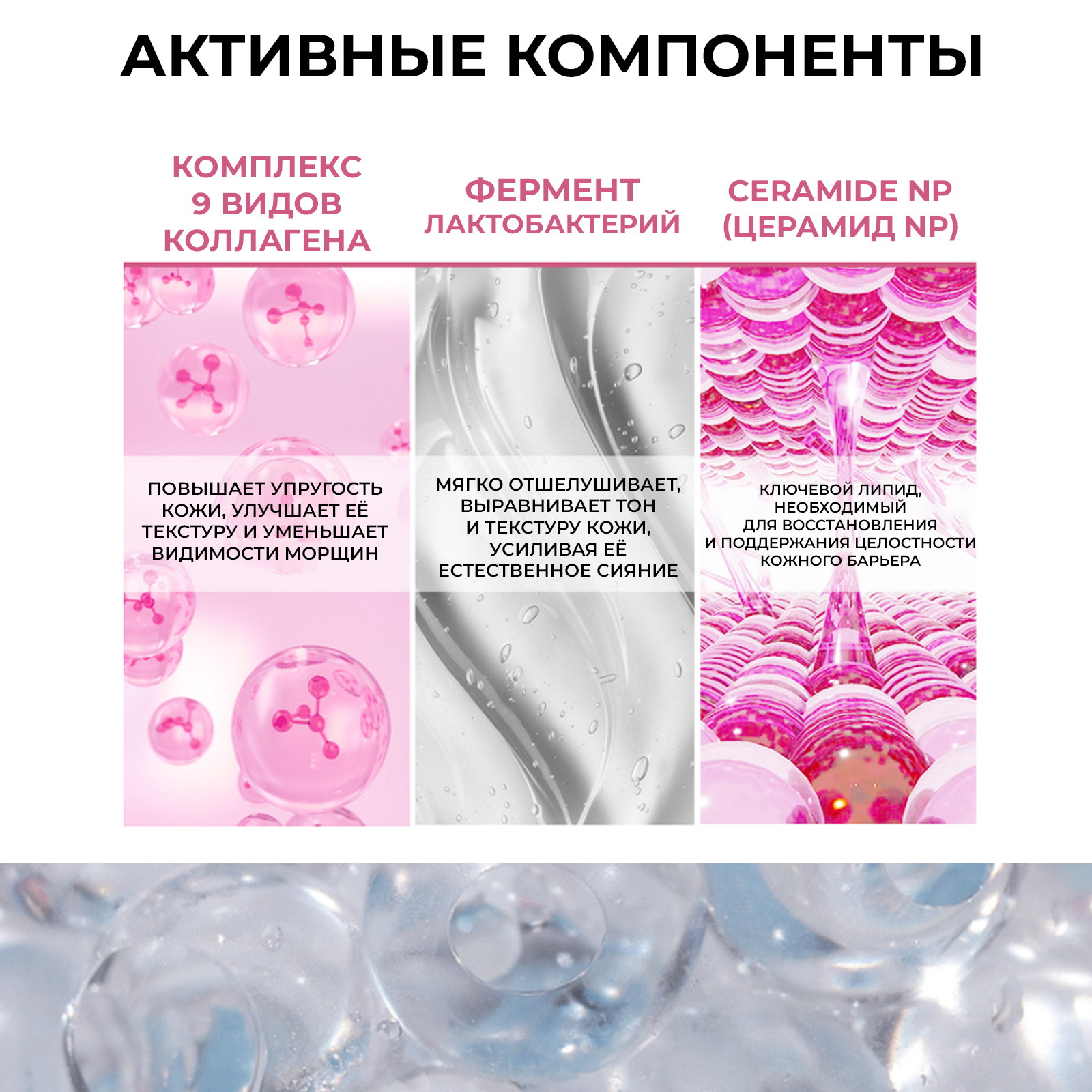 Комплекс 9 видов коллагена направлен на повышение упругости кожи, улучшение ее текстуры и уменьшение видимости морщин.