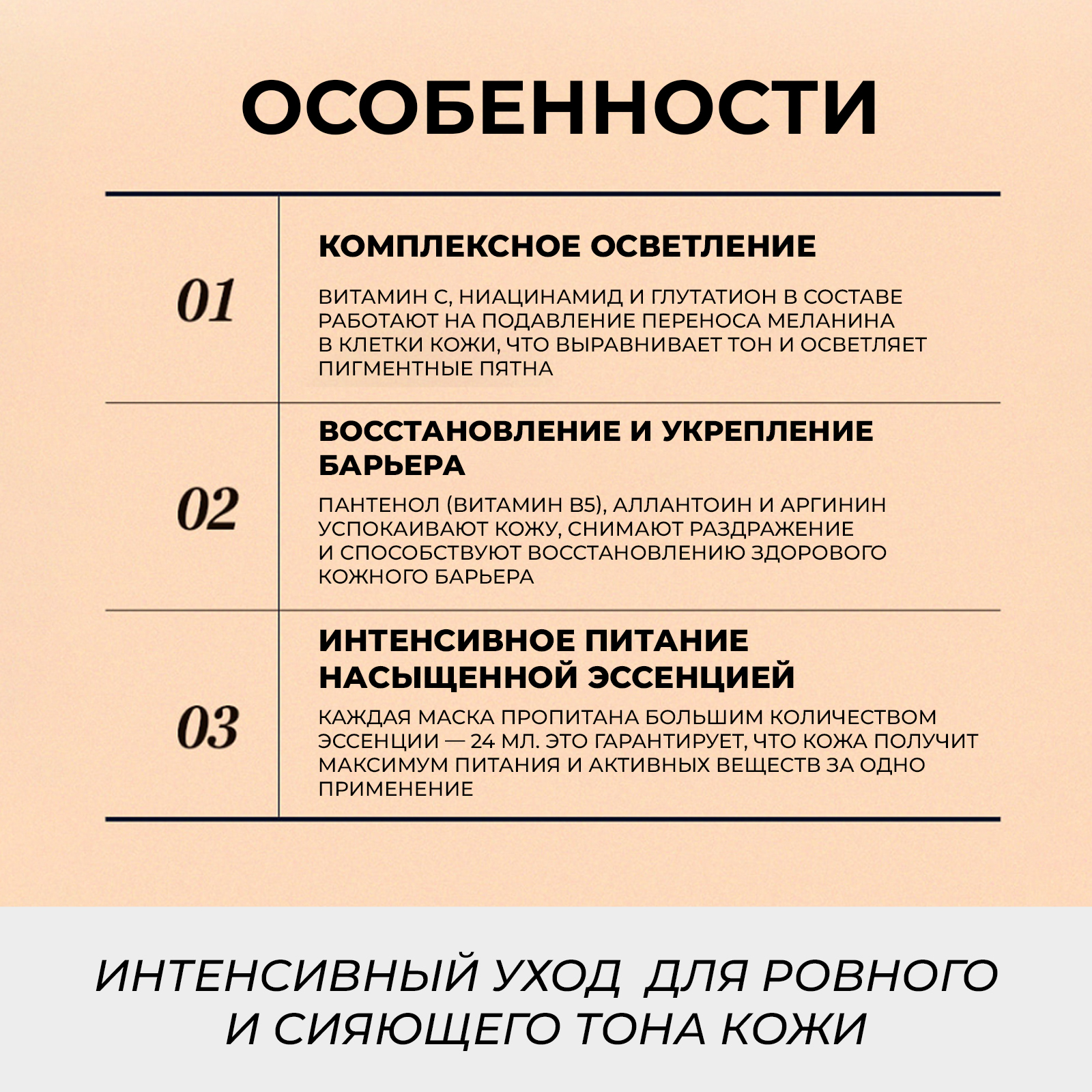 Способ применения: извлеките маску из упаковки. Затем расположите маску на поверхности очищенной кожи и оставьте на 15-20 минут. Аккуратно снимите маску и легко помассируйте, чтобы увлажняющая сыворотка впиталась. Эссенция сыворотки не требует смывания. Для достижения лучшего эффекта рекомендуется повторять процедуру 2-3 раза в неделю. Идеально для тусклой, уставшей кожи, склонной к пигментации, неровному тону и нуждающейся в антиоксидантной защите.