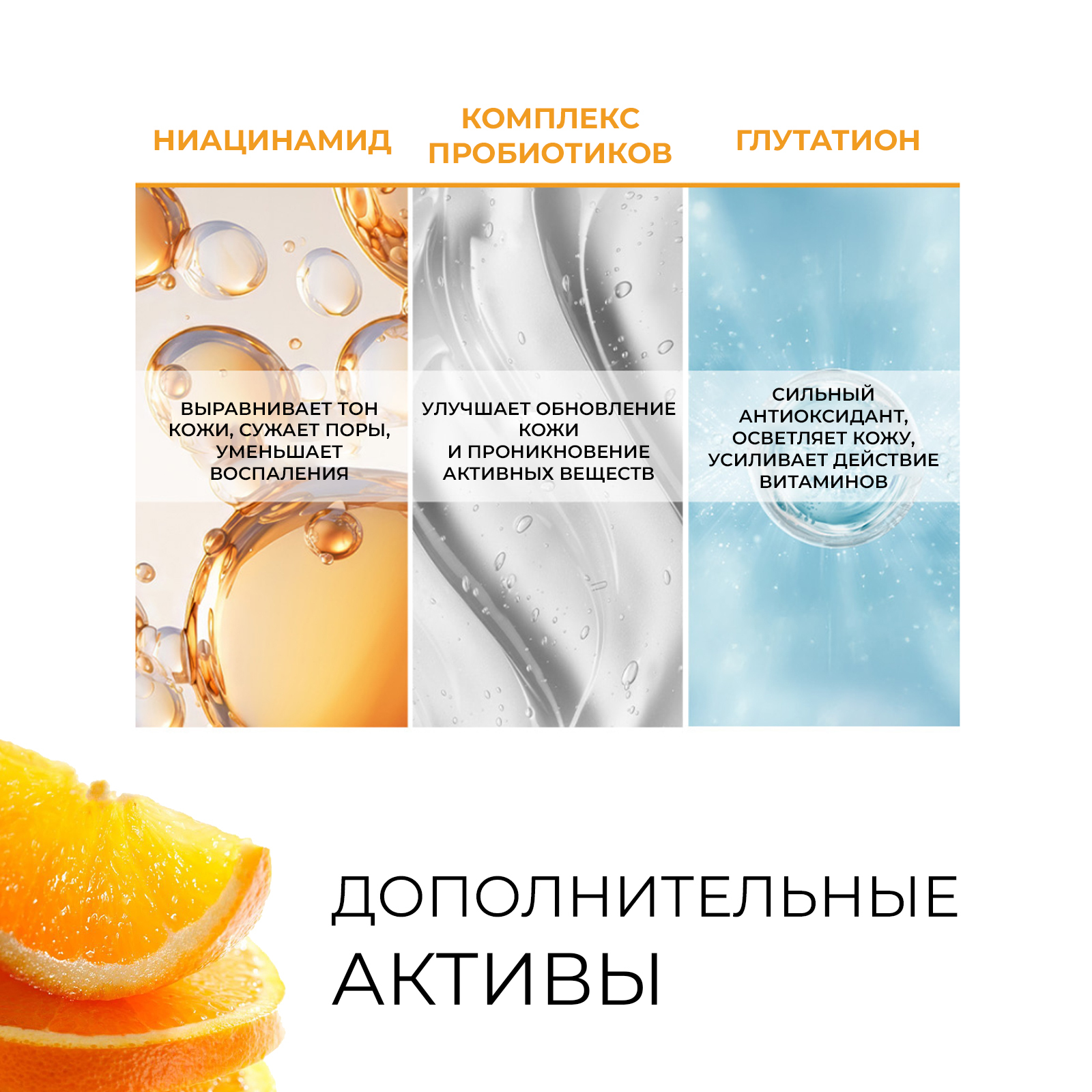 Витамин С Комплекс (Ascorbic Acid, Sodium Ascorbyl Phosphate, Tocopheryl Acetate) – мощнейший антиоксидант. Стимулирует синтез коллагена, осветляет пигментацию и придает коже яркое сияние. Наличие стабильных форм (SAP, Tocopheryl Acetate) обеспечивает пролонгированное действие.