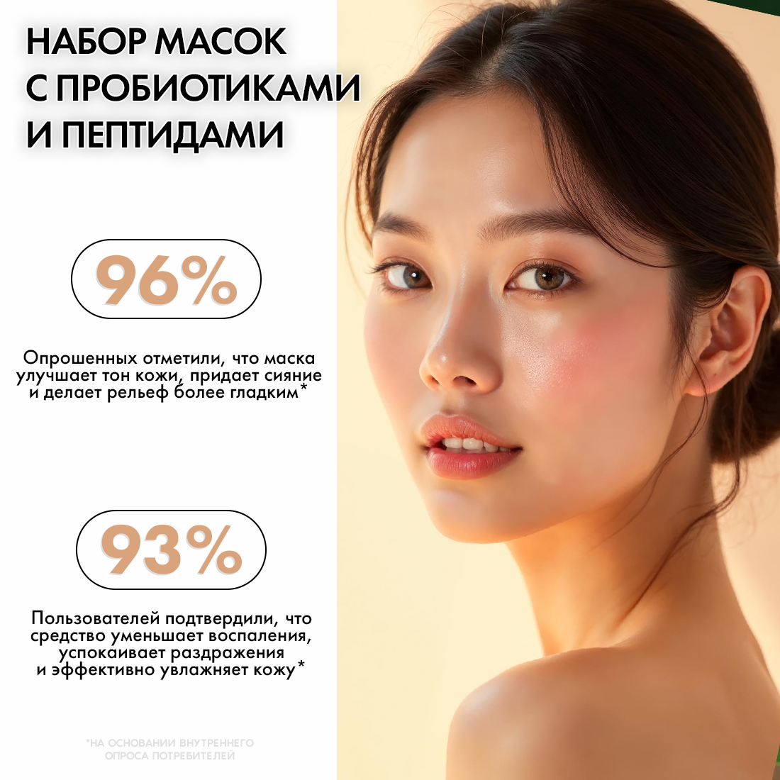 Маски с пробиотиками и пептидами нормализуют микробиом кожи, регулируют выработку меланина, выравнивая тон и препятствуя появлению пигментации. Восполняют недостаток влаги, смягчают огрубевшие участки кожи, придают естественное сияние и поддерживают гладкий рельеф. Тканевая основа, щедро пропитанная эссенцией, плотно прилегает к коже, транспортируя компоненты, которые глубоко увлажняют и укрепляют влагоудерживающий барьер, предотвращая появление сухости и шелушения. Особенно рекомендуются при состоянии акне, розацеа, куперозе, обезвоженности или избыточном выделении себума.