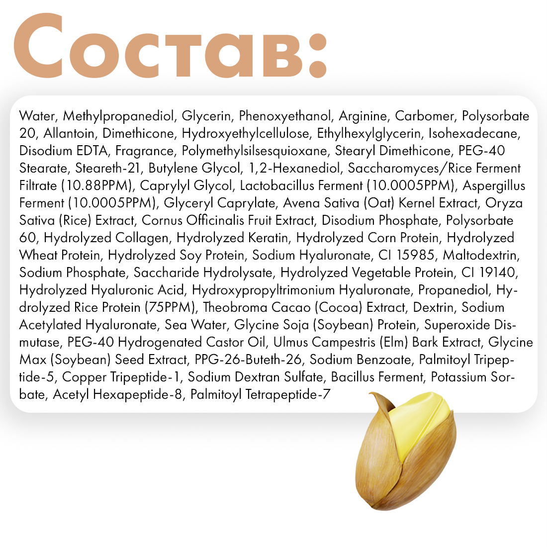 Состав: Water, Methylpropanediol, Glycerin, Phenoxyethanol, Arginine, Carbomer, Polysorbate 20, Allantoin, Dimethicone, Hydroxyethylcellulose, Ethylhexylglycerin, Isohexadecane, Disodium EDTA, Fragrance, Polymethylsilsesquioxane, Stearyl Dimethicone, PEG-40 Stearate, Steareth-21, Butylene Glycol, 1,2-Hexanediol, Saccharomyces/Rice Ferment Filtrate (10.88PPM), Caprylyl Glycol, Lactobacillus Ferment (10.0005PPM), Aspergillus Ferment (10.0005PPM), Glyceryl Caprylate, Avena Sativa (Oat) Kernel Extract, Oryza Sativa (Rice) Extract, Cornus Officinalis Fruit Extract, Disodium Phosphate, Polysorbate 60, Hydrolyzed Collagen, Hydrolyzed Keratin, Hydrolyzed Corn Protein, Hydrolyzed Wheat Protein, Hydrolyzed Soy Protein, Sodium Hyaluronate, CI 15985, Maltodextrin, Sodium Phosphate, Saccharide Hydrolysate, Hydrolyzed Vegetable Protein, CI 19140, Hydrolyzed Hyaluronic Acid, Hydroxypropyltrimonium Hyaluronate, Propanediol, Hydrolyzed Rice Protein (75PPM), Theobroma Cacao (Cocoa) Extract, Dextrin, Sodium Acetylated Hyaluronate, Sea Water, Glycine Soja (Soybean) Protein, Superoxide Dismutase, PEG-40 Hydrogenated Castor Oil, Ulmus Campestris (Elm) Bark Extract, Glycine Max (Soybean) Seed Extract, PPG-26-Buteth-26, Sodium Benzoate, Palmitoyl Tripeptide-5, Copper Tripeptide-1, Sodium Dextran Sulfate, Bacillus Ferment, Potassium Sorbate, Acetyl Hexapeptide-8, Palmitoyl Tetrapeptide-7.