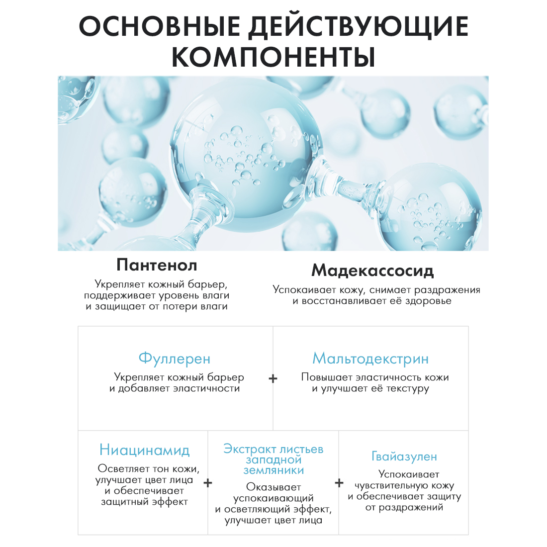 Состав: Water, Glycereth-26, Glycerin, Methylpropanediol, Dipropylene Glycol, Methyl Gluceth-20, Hydroxyacetophenone, Arginine, Carbomer, Caprylyl Glycol, Betaine, Polyglyceryl-10 Laurate, Panthenol (1,000PPM), Ethylhexylglycerin, Trehalose, Hydroxyethylcellulose, Disodium EDTA, Xanthan Gum, Allantoin, Niacinamide, 1,2-Hexanediol, Fragrance, Sodium Hyaluronate, Guaiazulene, Maltodextrin, Dipotassium Glycyrrhizate, Hydrolyzed Hyaluronic Acid, Disodium Phosphate, Polysorbate 60, Butylene Glycol, Rubus Fruticosus (Blackberry) Leaf Extract, CI 42090, Sodium Acetylated Hyaluronate, Sodium Phosphate, Caprylic/Capric Triglyceride, Hydrogenated Phosphatidylcholine, Centella Asiatica Extract, Sucrose Stearate, Ferulic Acid, Sclerotium Gum, Beta-Glucan, Cetearyl Alcohol, Fullerenes, Astaxanthin, Polyglyceryl-10 Diisostearate, Hydrogenated Lecithin, Pentylene Glycol, Asiaticoside, Madecassic Acid, Asiatic Acid, Madecassoside, PVP.