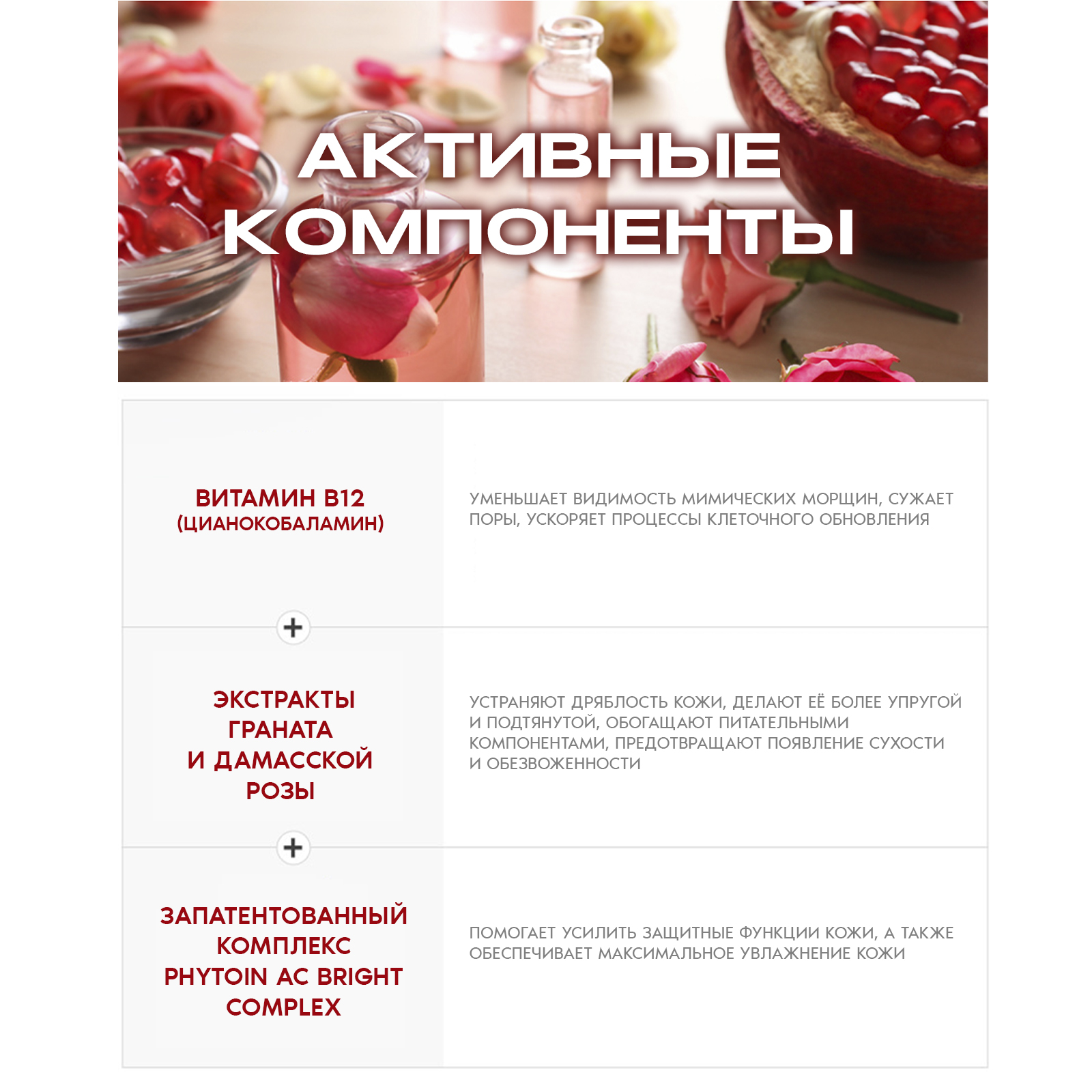 увлажнение , anti-age , сияние кожи , улучшение тона кожи , повышение упругости , питание , повышение эластичности , лифтинг , омоложение , осветление , отбеливающий эффект
