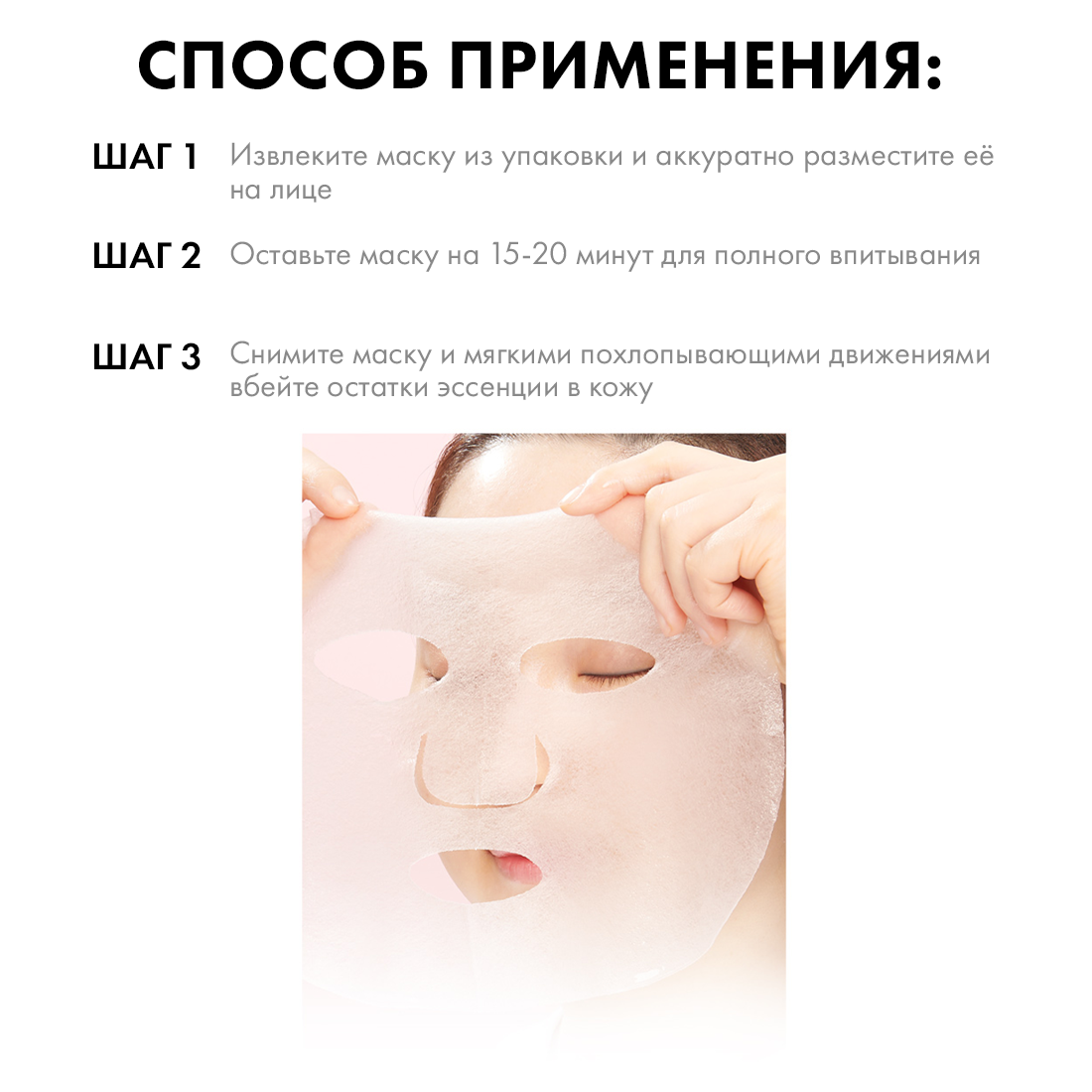 Способ применения: Извлеките маску из упаковки. Затем расположите маску на поверхности очищенной, тонизированной кожи и оставьте на 10-20 минут. Аккуратно снимите маску и легко помассируйте, чтобы увлажняющая сыворотка впиталась. Не требует смывания. Подходит для ежедневного использования. Для всех типов кожи. При обнаружении чувствительности к компонентам прекратить использование. Маска предназначена для одноразового применения.