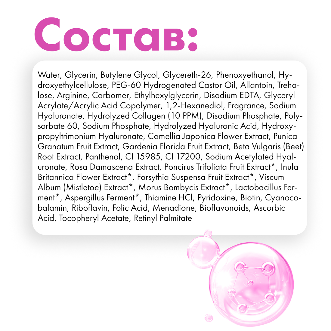 Состав: Water, Glycerin, Butylene Glycol, Glycereth-26, Phenoxyethanol, Hydroxyethylcellulose, PEG-60 Hydrogenated Castor Oil, Allantoin, Trehalose, Arginine, Carbomer, Ethylhexylglycerin, Disodium EDTA, Glyceryl Acrylate/Acrylic Acid Copolymer, 1,2-Hexanediol, Fragrance, Sodium Hyaluronate, Hydrolyzed Collagen (10 PPM), Disodium Phosphate, Polysorbate 60, Sodium Phosphate, Hydrolyzed Hyaluronic Acid, Hydroxypropyltrimonium Hyaluronate, Camellia Japonica Flower Extract, Punica Granatum Fruit Extract, Gardenia Florida Fruit Extract, Beta Vulgaris (Beet) Root Extract, Panthenol, CI 15985, CI 17200, Sodium Acetylated Hyaluronate, Rosa Damascena Extract, Poncirus Trifoliata Fruit Extract*, Inula Britannica Flower Extract*, Forsythia Suspensa Fruit Extract*, Viscum Album (Mistletoe) Extract*, Morus Bombycis Extract*, Lactobacillus Ferment*, Aspergillus Ferment*, Thiamine HCl, Pyridoxine, Biotin, Cyanocobalamin, Riboflavin, Folic Acid, Menadione, Bioflavonoids, Ascorbic Acid, Tocopheryl Acetate, Retinyl Palmitate.