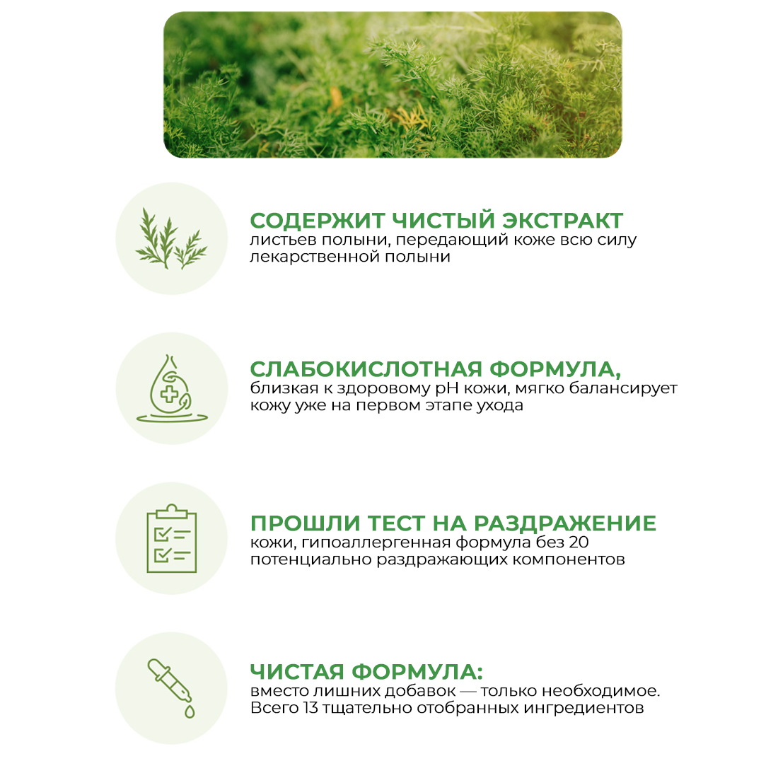 Тонер-диски отлично увлажняют и смягчают кожу, способствуют сужению пор и нормализации выработки кожного сала. Очищают, улучшают цвет лица, регенерируют, восстанавливают и устраняют микроповреждения. Главным ингредиентом в составе является 70% экстракта полыни, который снимает покраснения, оказывает бактерицидное и антисептическое действие, предотвращает появление раздражений. Тонер-пэды эффективны при уходе за кожей с куперозом, можно использовать для борьбы с демодекозом, дерматитами и прочими заболеваниями эпидермиса. Средство дерматологически протестировано и признано безопасным для чувствительной кожи лица. Вегетарианский продукт. PH 5.5.