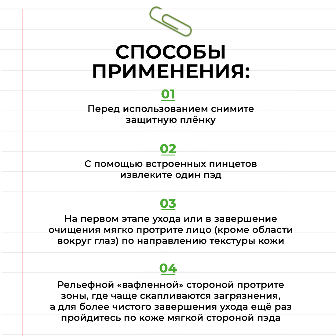 Способ применения: Извлеките пэд и протрите предварительно очищенную сухую кожу рельефной стороной, избегая область вокруг глаз и губ. Переверните пэд гладкой стороной и мягко протрите кожу. Остатки тонера мягко вбейте в кожу лица подушечками пальцев. Для усиления эффекта и в зонах, требующих особого внимания, диски можно использовать в качестве успокаивающей и увлажняющей маски. Приложите диск на выбранный участок и оставьте на 10-15 минут.