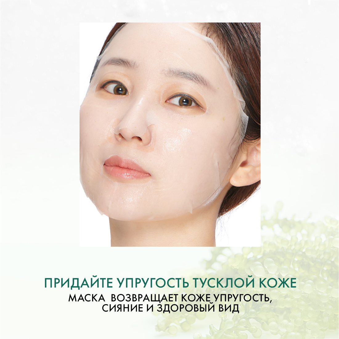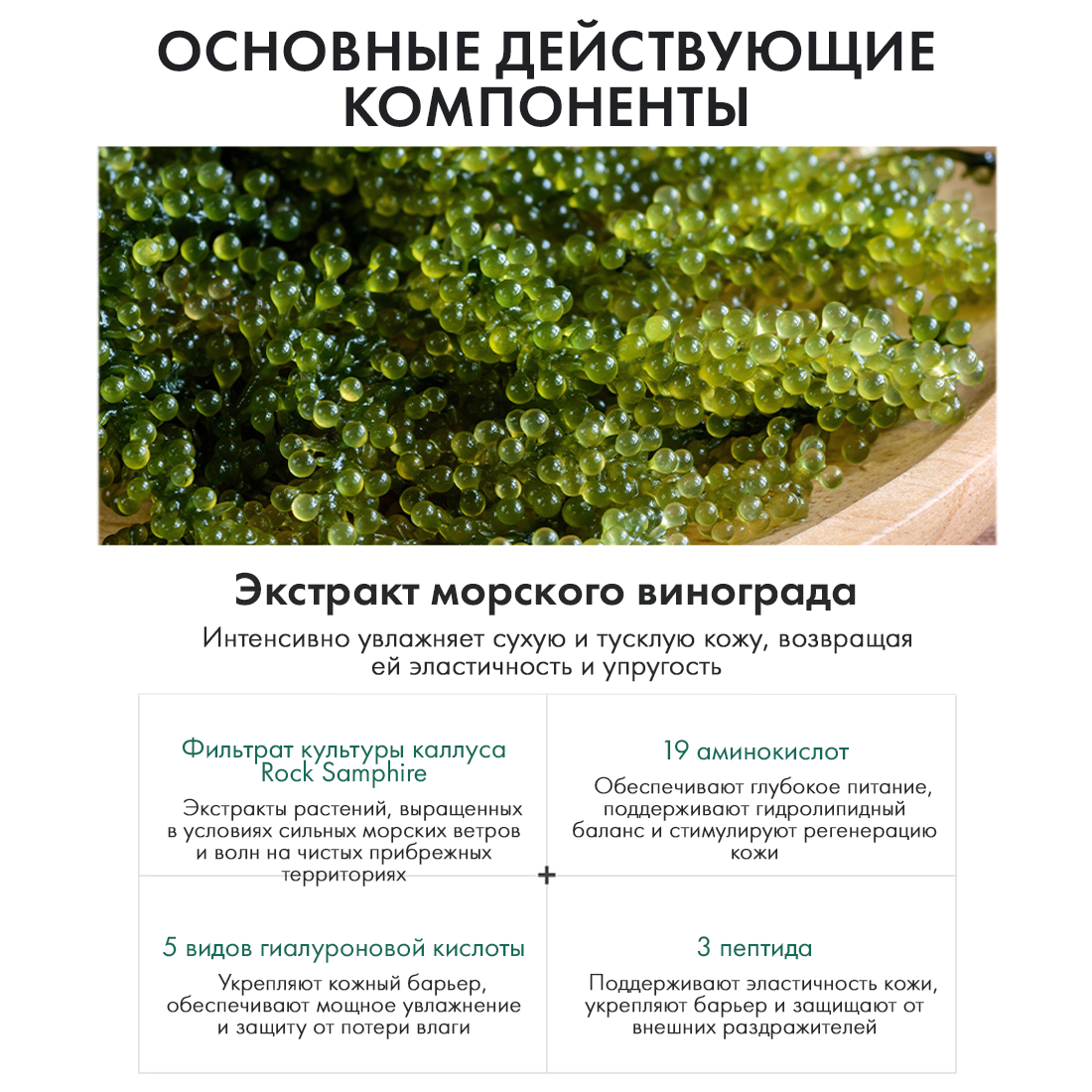 Маска с экстрактом морского винограда снимает зуд и покраснения на коже, ускоряет заживление воспалений, интенсивно увлажняет и борется с шелушениями. Образует на поверхности эпидермиса защитный барьер, способный остановить дегидратацию кожи и сохранить оптимальный уровень увлажнения в коже. Экстракт каулерпы (морского винограда) питает, увлажняет, выводит токсины, активизирует обменные процессы в клетках, повышает тонус и эластичность кожи. А также является мощным антиоксидантом и способствует регенерации клеток кожи, избавлению от гиперкератоза и пигментных пятен. 19 аминокислот направлены на активное питание обезвоженной кожи, восстанавливают, устраняют микроповреждения и разглаживают кожу. Три вида пептида повышают и поддерживают активность клеток, стимулируют синтез полезных веществ, улучшают структуру и укрепляют матрикс кожи. Уже после первого применения кожа становится сияющей и свежей, выглядит отдохнувшей и ухоженной. Тонкая тканевая основа маски щедро пропитана эссенцией с зелеными капсулами, плотно прилегает к поверхности кожи и насыщает ее полезными веществами.