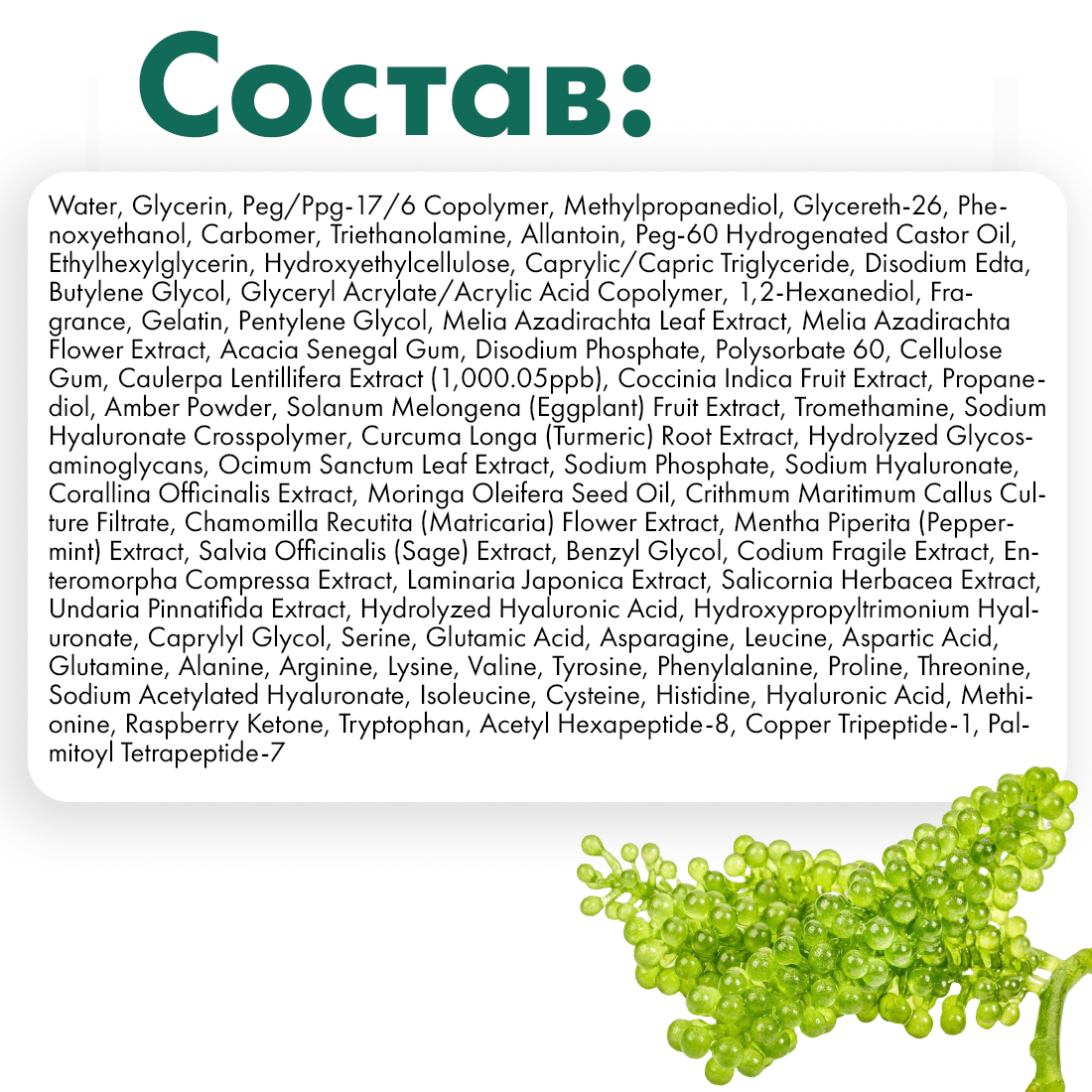 Состав: Water, Glycerin, PEG/PPG-17/6 Copolymer, Methylpropanediol, Glycereth-26, Phenoxyethanol, Carbomer, Triethanolamine, Allantoin, PEG-60 Hydrogenated Castor Oil, Ethylhexylglycerin, Hydroxyethylcellulose, Caprylic/Capric Triglyceride, Disodium Edta, Butylene Glycol, Glyceryl Acrylate/Acrylic Acid Copolymer, 1,2-Hexanediol, Fragrance, Gelatin, Pentylene Glycol, Melia Azadirachta Leaf Extract, Melia Azadirachta Flower Extract, Acacia Senegal Gum, Disodium Phosphate, Polysorbate 60, Cellulose Gum, Caulerpa Lentillifera Extract(1,000.05ppb), Coccinia Indica Fruit Extract, Propanediol, Amber Powder, Solanum Melongena (Eggplant) Fruit Extract, Tromethamine, Sodium Hyaluronate Crosspolymer, Curcuma Longa (Turmeric) Root Extract, Hydrolyzed Glycosaminoglycans, Ocimum Sanctum Leaf Extract, Sodium Phosphate, Sodium Hyaluronate, Corallina Officinalis Extract, Moringa Oleifera Seed Oil, Crithmum Maritimum Callus Culture Filtrate, Chamomilla Recutita (Matricaria) Flower Extract, Mentha Piperita (Peppermint) Extract, Salvia Officinalis (Sage) Extract, Benzyl Glycol, Codium Fragile Extract, Enteromorpha Compressa Extract, Laminaria Japonica Extract, Salicornia Herbacea Extract, Undaria Pinnatifida Extract, Hydrolyzed Hyaluronic Acid, Hydroxypropyltrimonium Hyaluronate, Caprylyl Glycol, Serine, Glutamic Acid, Asparagine, Leucine, Aspartic Acid, Glutamine, Alanine, Arginine, Lysine, Valine, Tyrosine, Phenylalanine, Proline, Threonine, Sodium Acetylated Hyaluronate, Isoleucine, Cysteine, Histidine, Hyaluronic Acid, Methionine, Raspberry Ketone, Tryptophan, Acetyl Hexapeptide-8, Copper Tripeptide-1, Palmitoyl Tetrapeptide-7